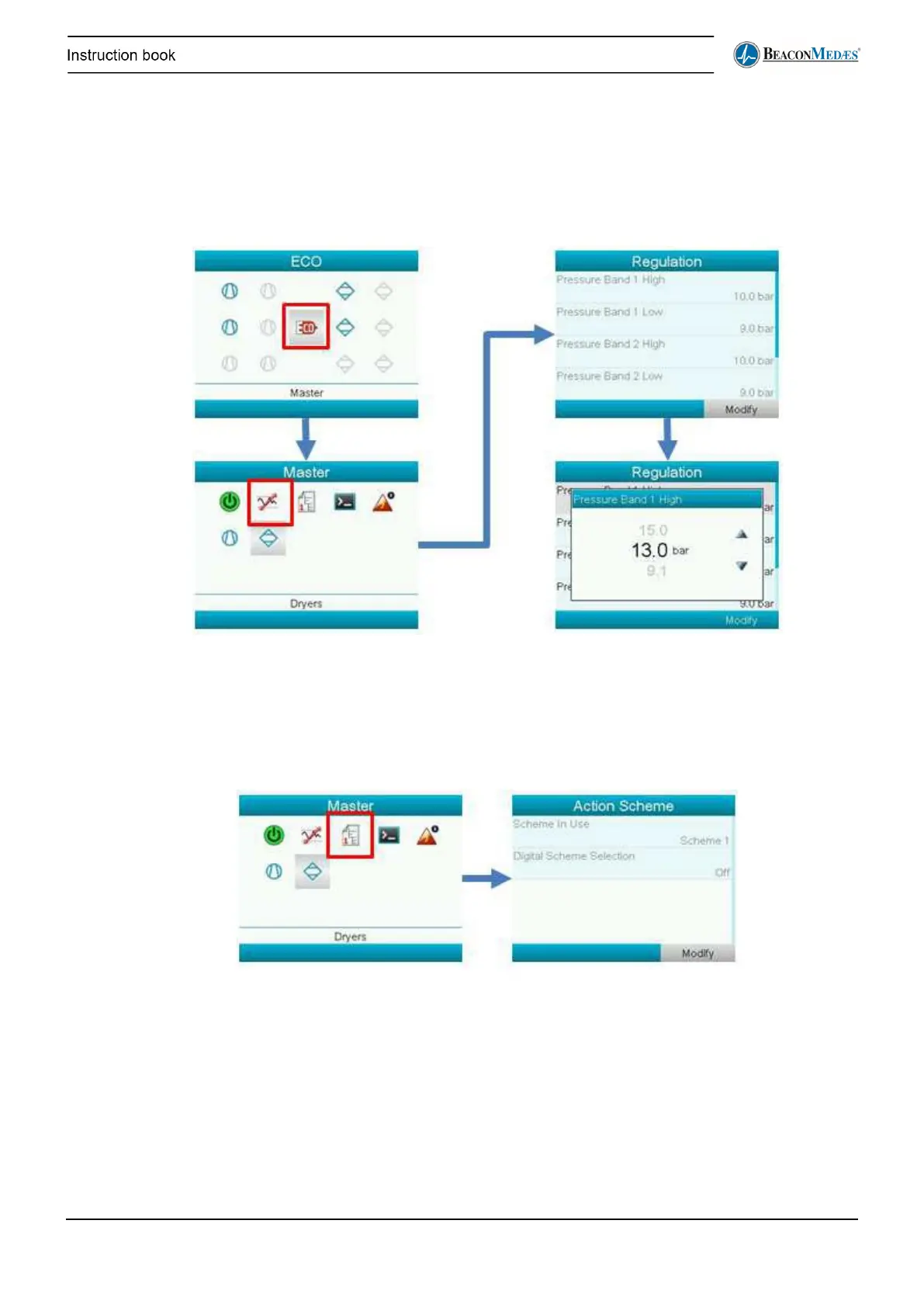 In the Regulation submenu the user can adapt the pressure bands (minimum and maximum