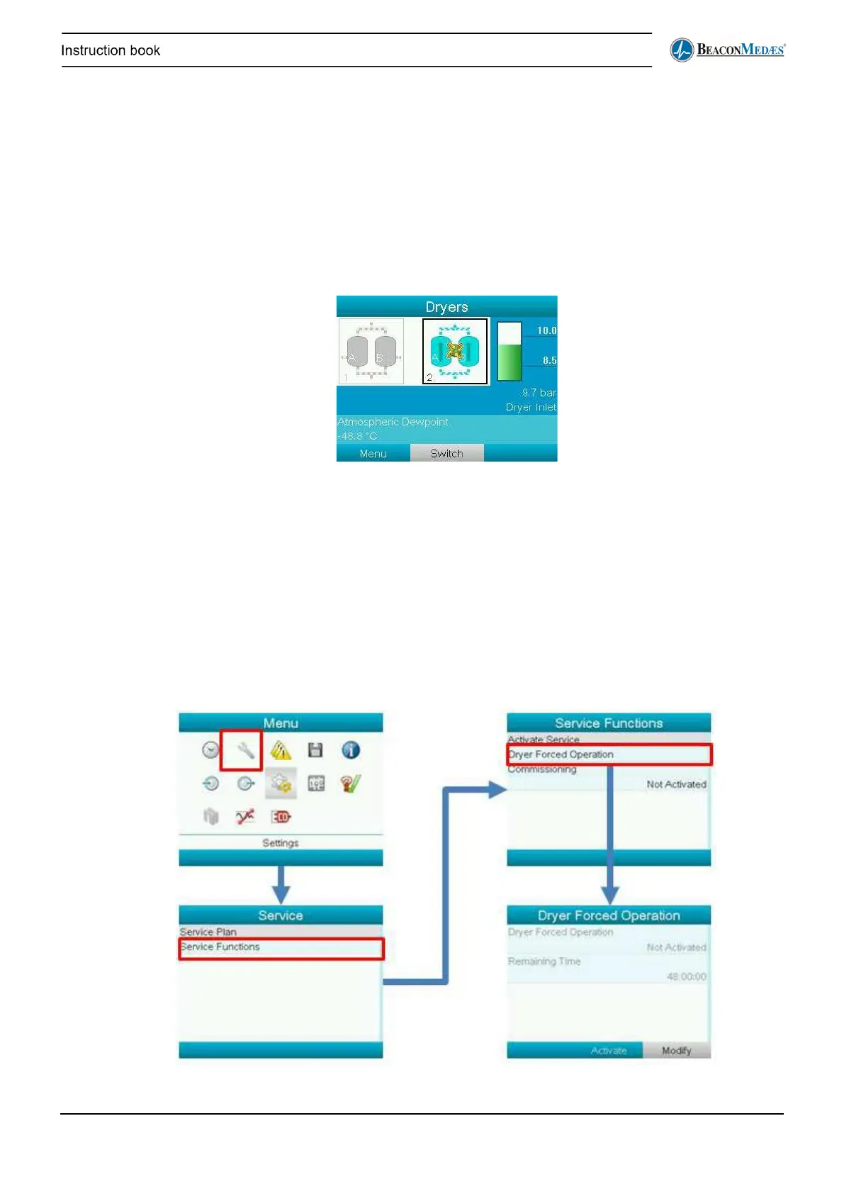 If the service function is activated, it will not be possible to switch dryers (either manual or