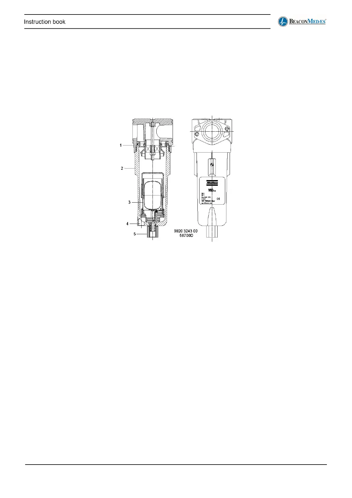 2. Depressurize the separator by opening the manual drain valve on connection (4).