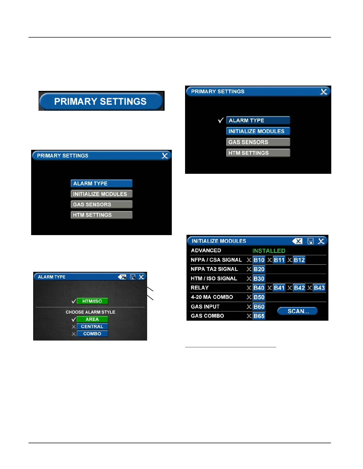 ALARM TYPE checked, INITIALIZE MODULES active, and