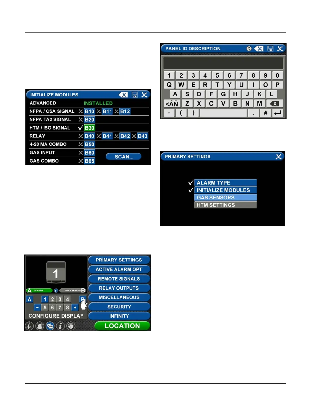 ALARM TYPE and INITIALIZE MODULES highlighted and