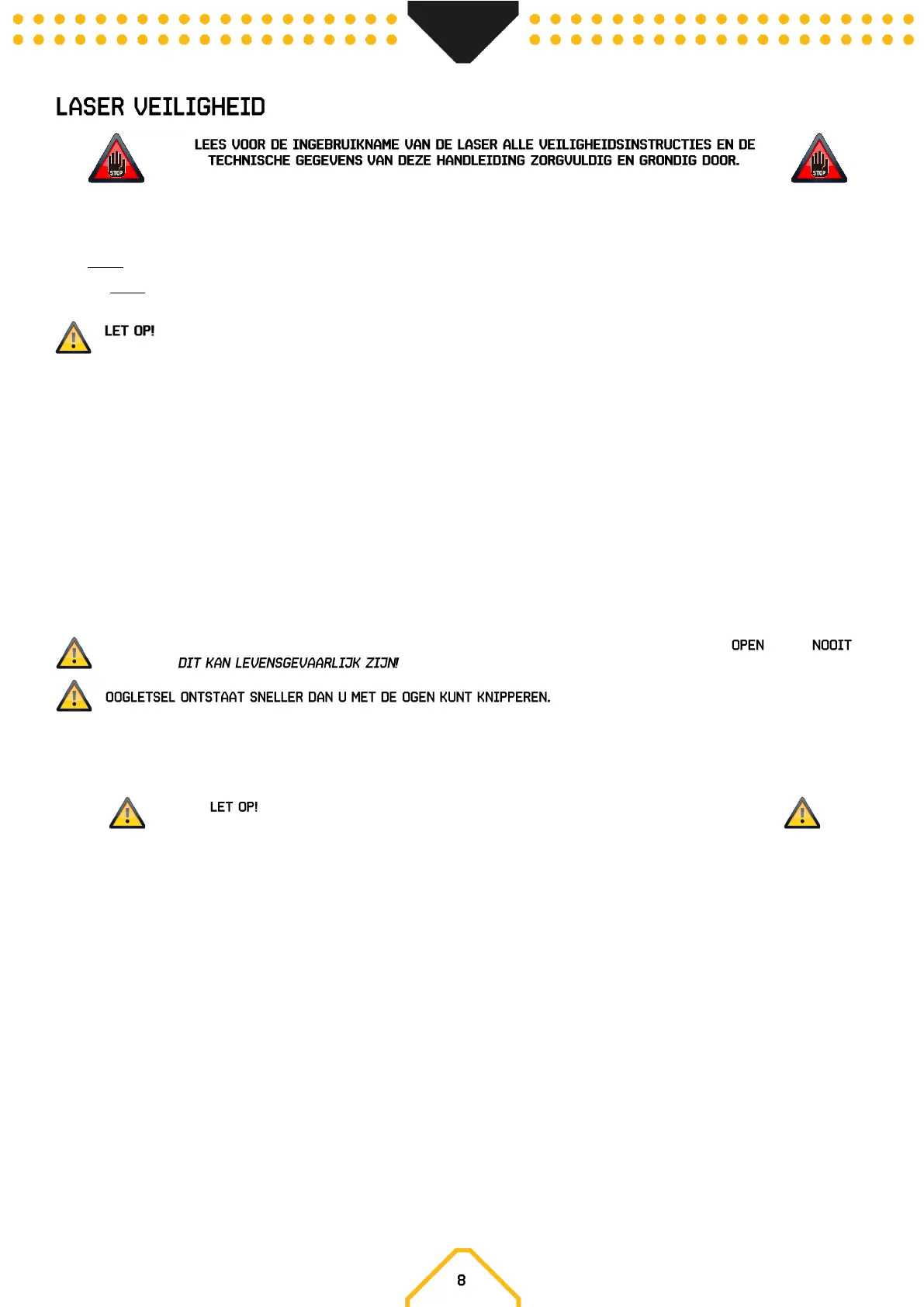 • Richt een laserstraal nooit op mensen en dieren. Kijk nooit in de laseropening of laserstralen, dit kan oogletsel of blindheid veroorzaken.
