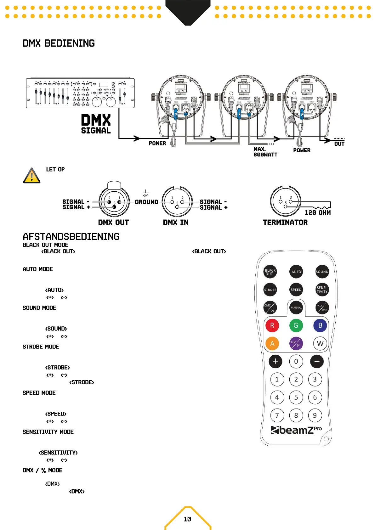 ! Bij het laatste apparaat, dient u de DMX-lijn af te sluiten met een eindweerstand. Neem een XLR connector en soldeer een 120 Ohm
