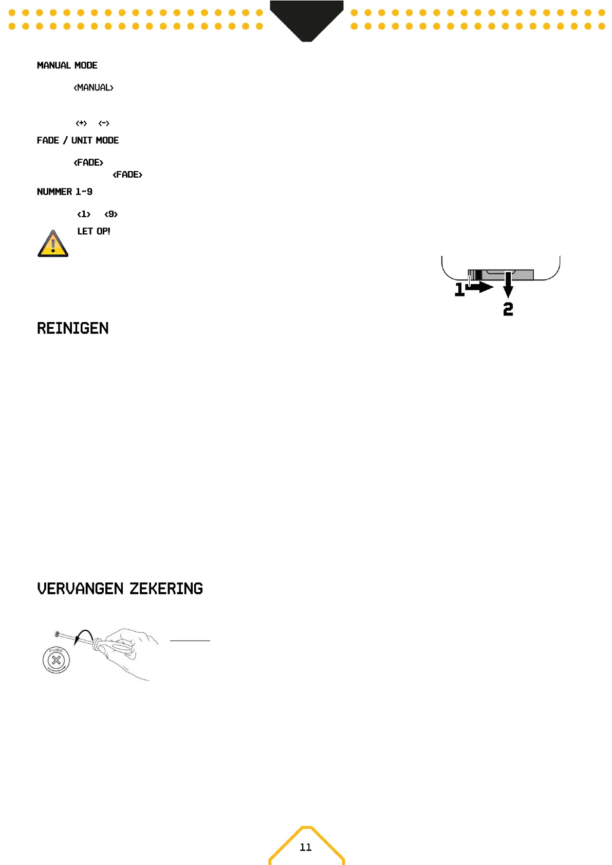 Indien de zekering defect is, dient u de zekering te vervangen door een zekering van hetzelfde type en waarde. Voor het vervangen van de zekering,