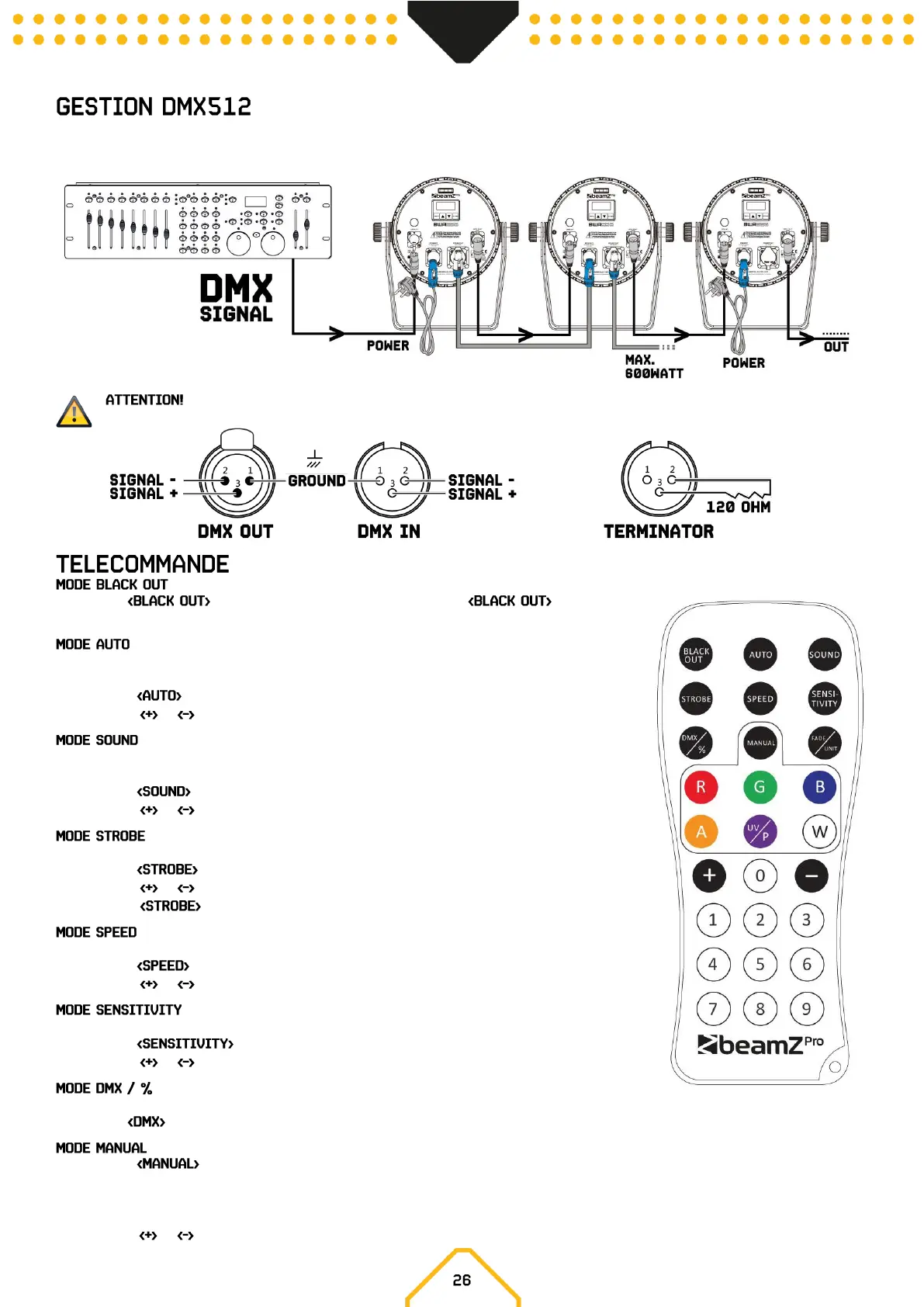 résistance de 120 ohms entre le signal (-) et le signal (+) et connectez-la à la sortie DMX du dernier appareil sur la ligne.