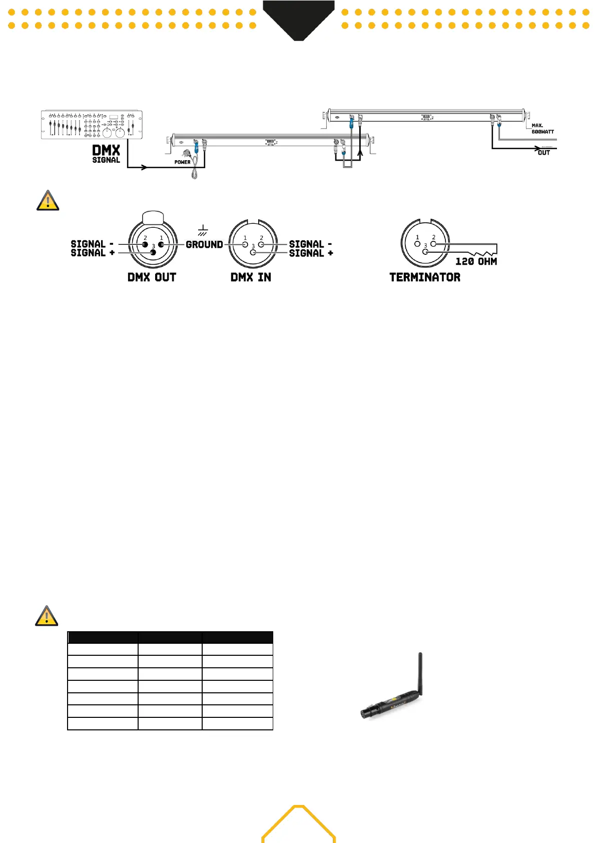 ATTENTION! sur le dernier appareil, vous devez terminer la ligne DMX avec une résistance. Prenez un connecteur XLR et soudez une