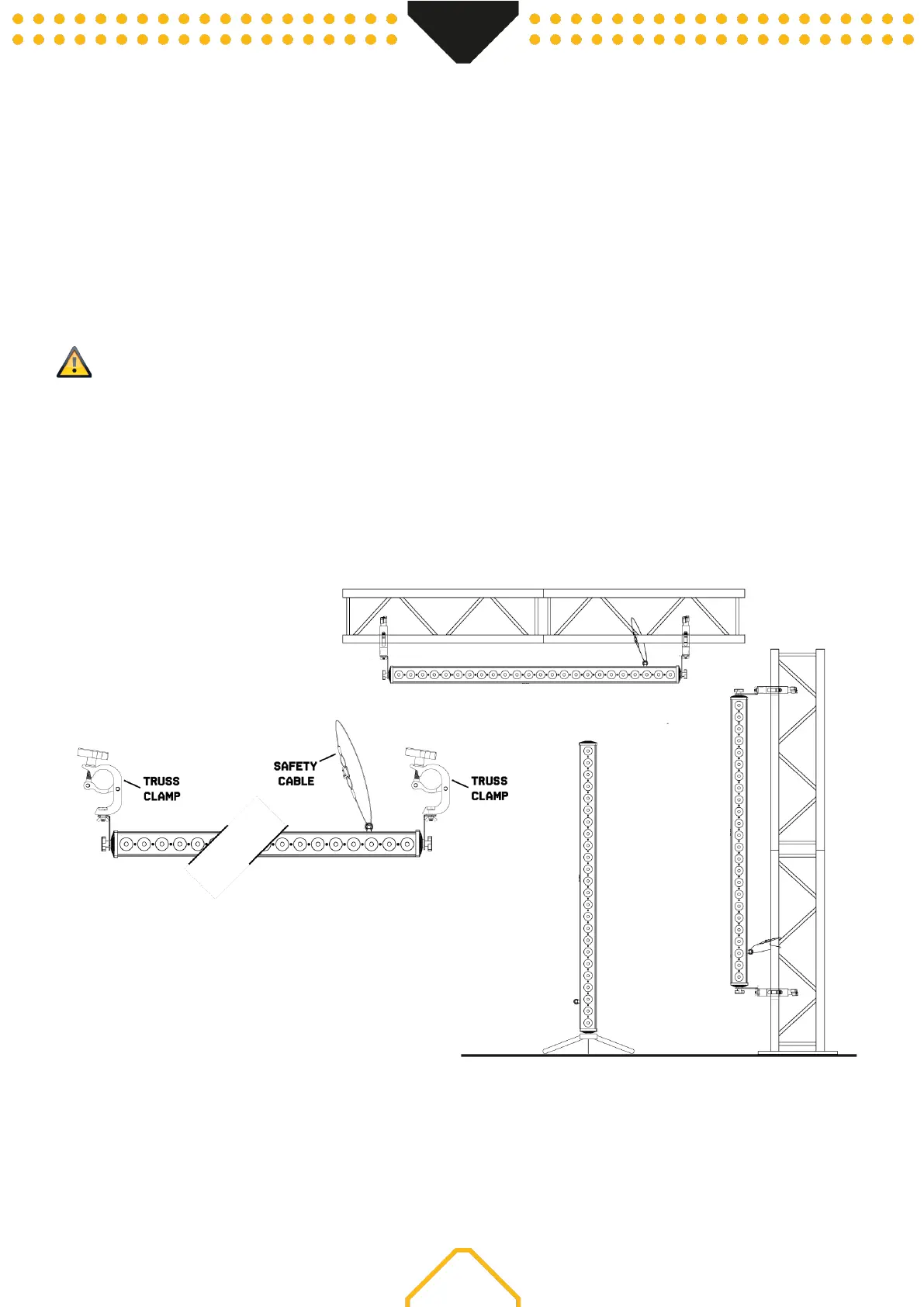 het apparaat ook ondersteboven aan een truss gemonteerd worden, zie onderstaande afbeelding. Voor de bevestiging zijn gecertificeerde klemmen