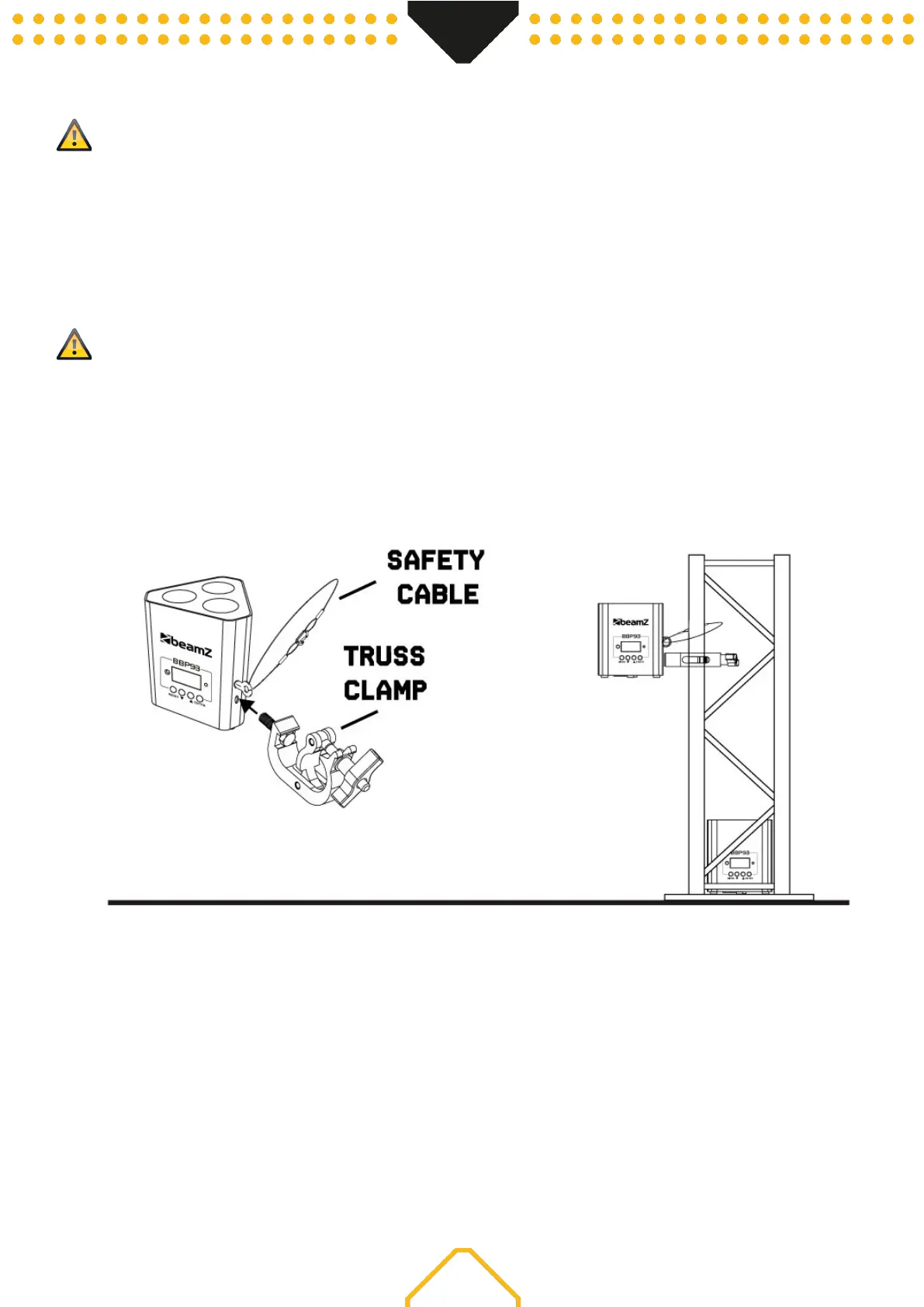 When carrying out any installation, always comply European and national guidelines concerning rigging, truss and all other safety issues. Always let the
