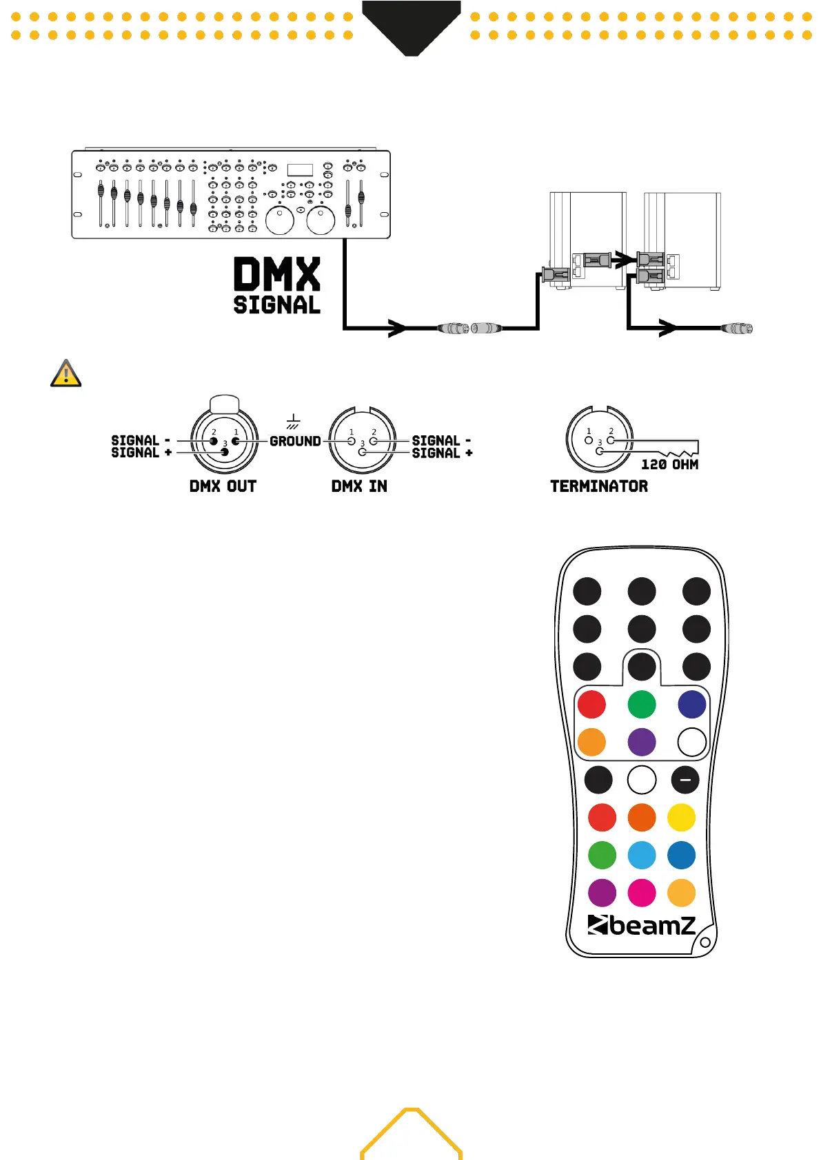 CAUTION! At the last unit, you must close the DMX line with a terminating resistor. Take an XLR connector and solder a 120 Ohm resistor