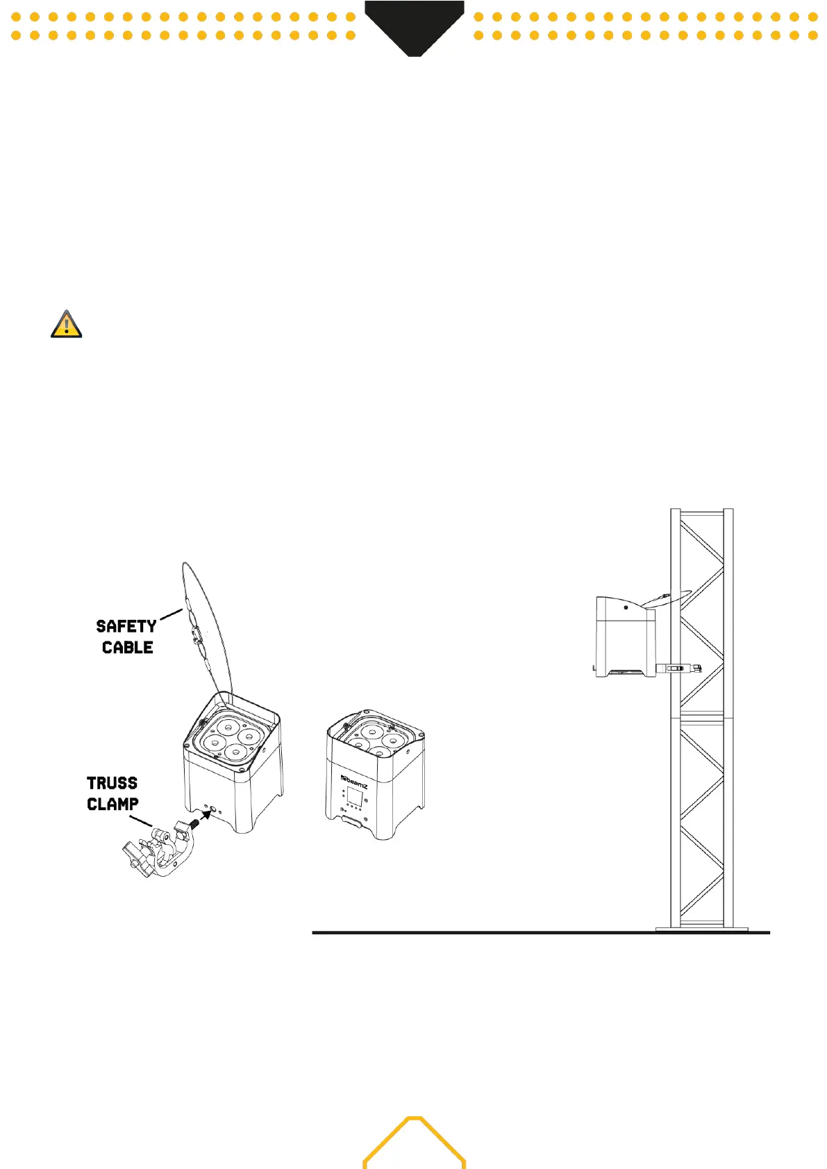 het apparaat ook ondersteboven aan een truss gemonteerd worden, zie onderstaande afbeelding. Voor de bevestiging zijn gecertificeerde klemmen
