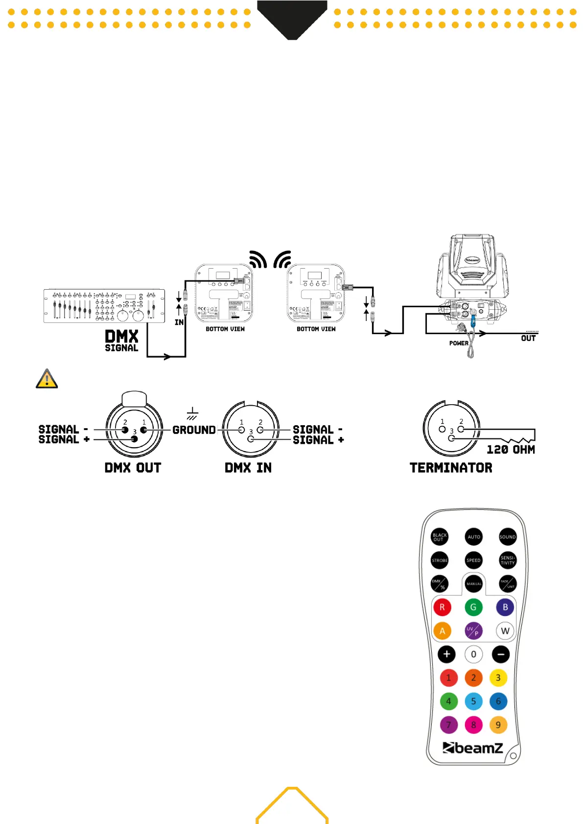 resistencia de 120 Ohm entre la señal (-) y la señal (+) y conéctela a la salida DMX del último dispositivo en la línea.