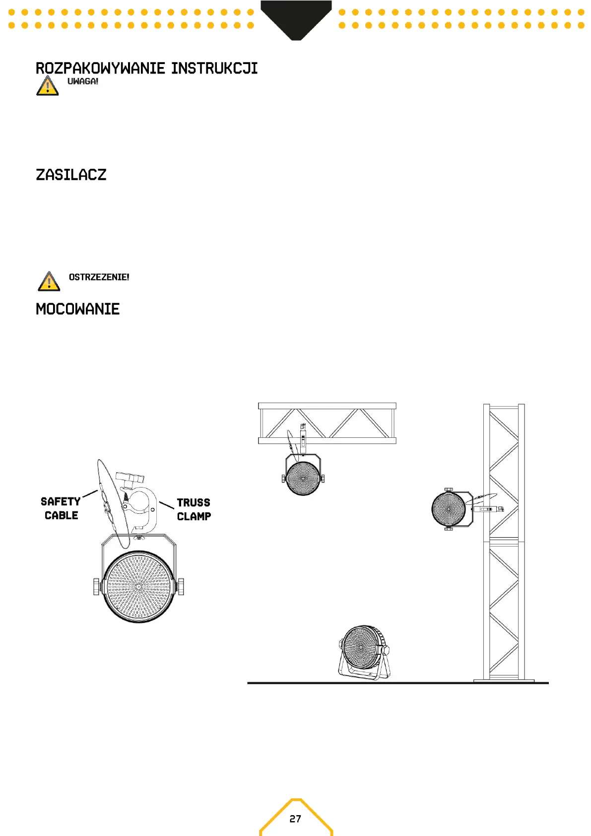 zamontować do góry nogami do kratownicy, patrz poniższy rysunek. Do zamocowania wymagane są certyfikowane zaciski o prawidłowym obciążeniu