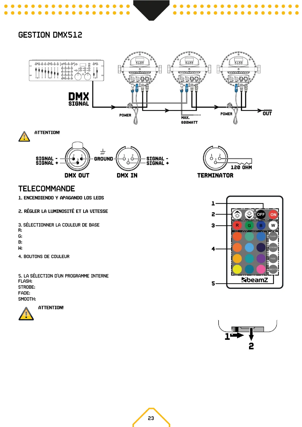 de 120 ohms entre le signal (-) et le signal (+) et connectez-la à la sortie DMX du dernier appareil sur la ligne.
