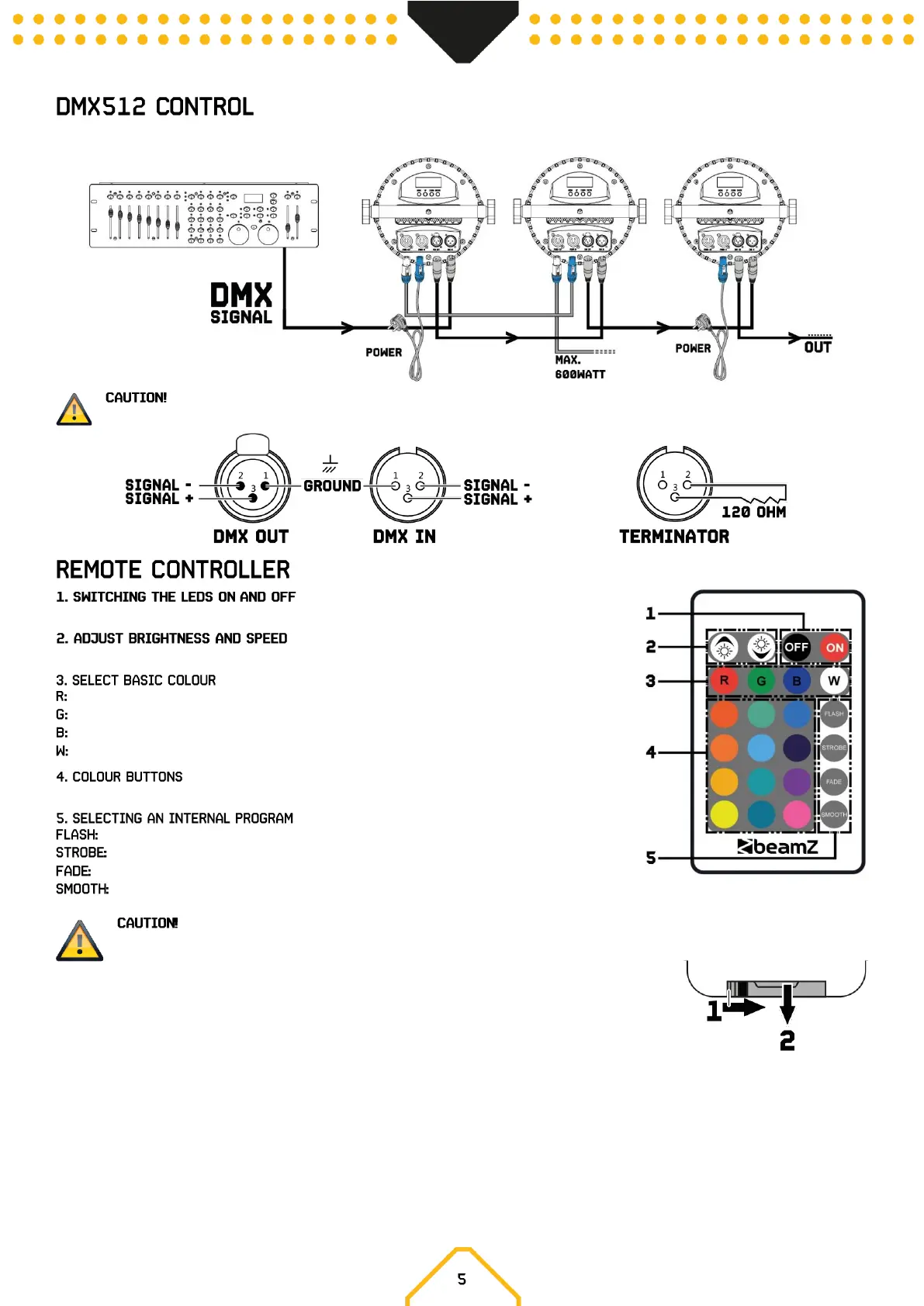 between signal (-) and signal (+) and connect it to the DMX output of the last unit in the line.