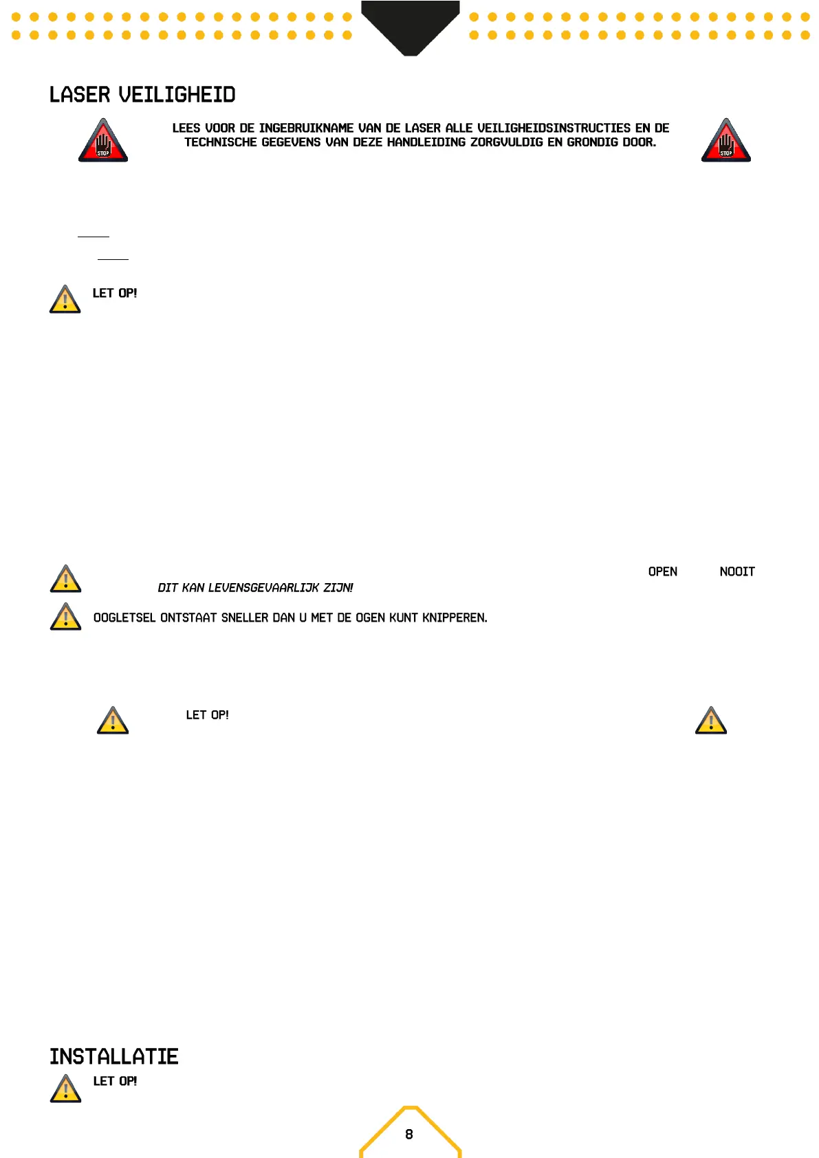 • Richt een laserstraal nooit op mensen en dieren. Kijk nooit in de laseropening of laserstralen, dit kan oogletsel of blindheid veroorzaken.