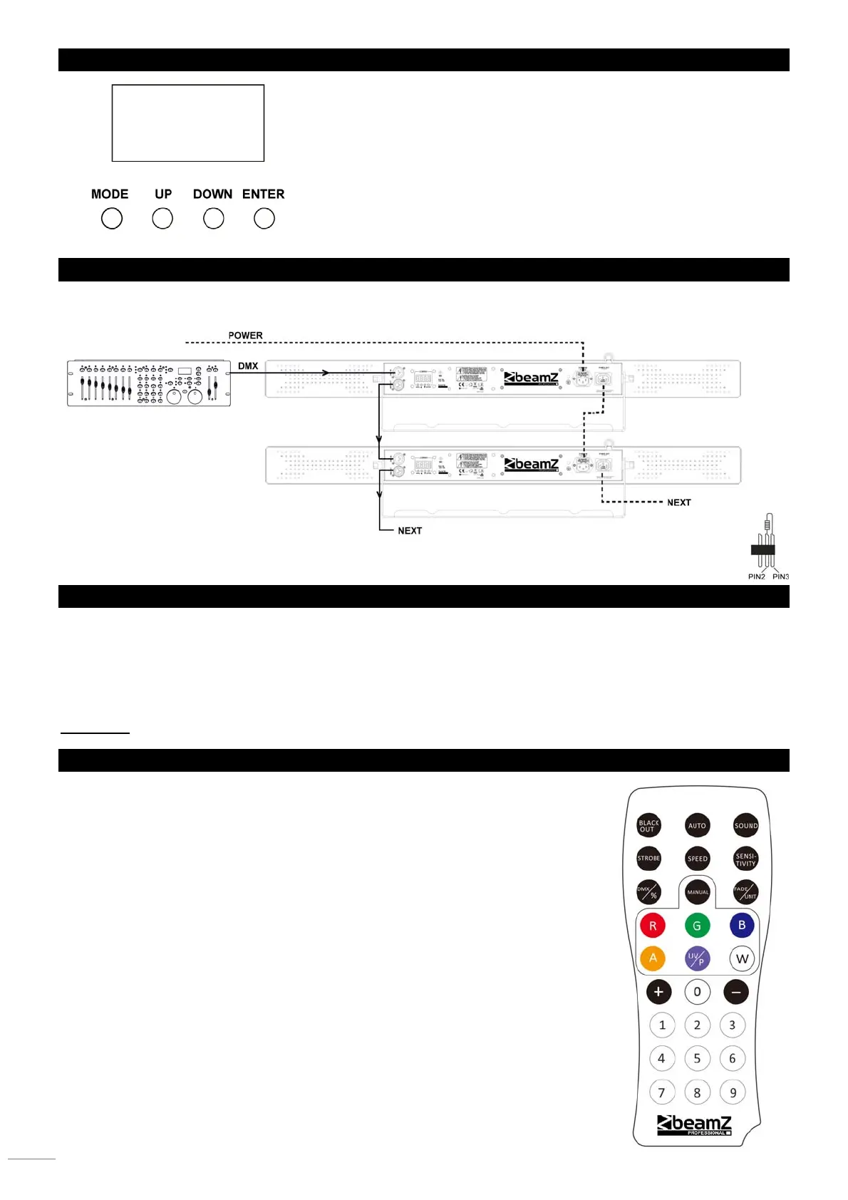 Podłącz 3-pinowy kabel DMX do wyjścia DMX w pierwszym urządzeniu oraz wejścia DMX w kolejnym urządzeniu. Powtórz