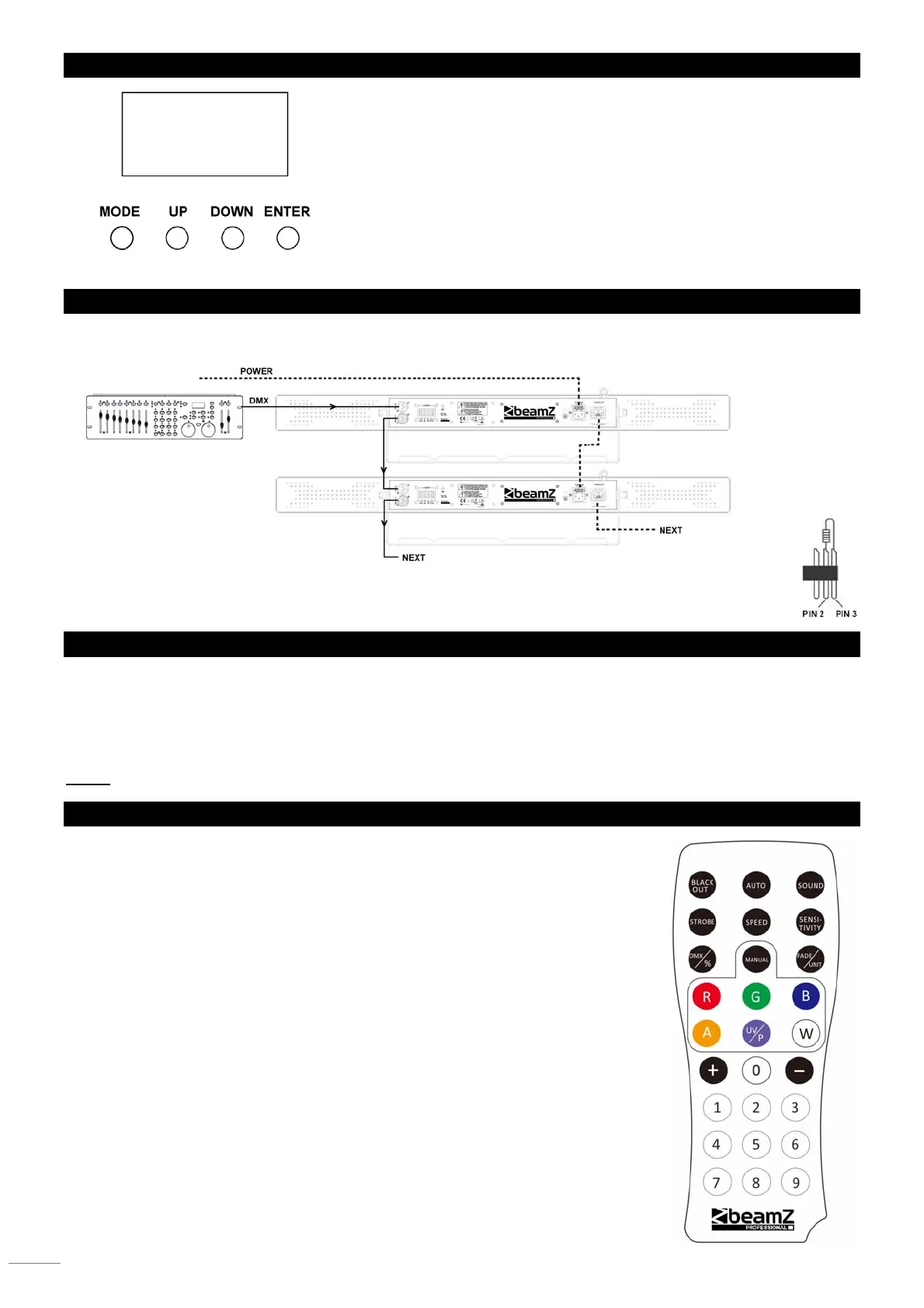 first unit in a DMX-chain. Always connect the output of one unit with the input of the next unit until all units are connected.