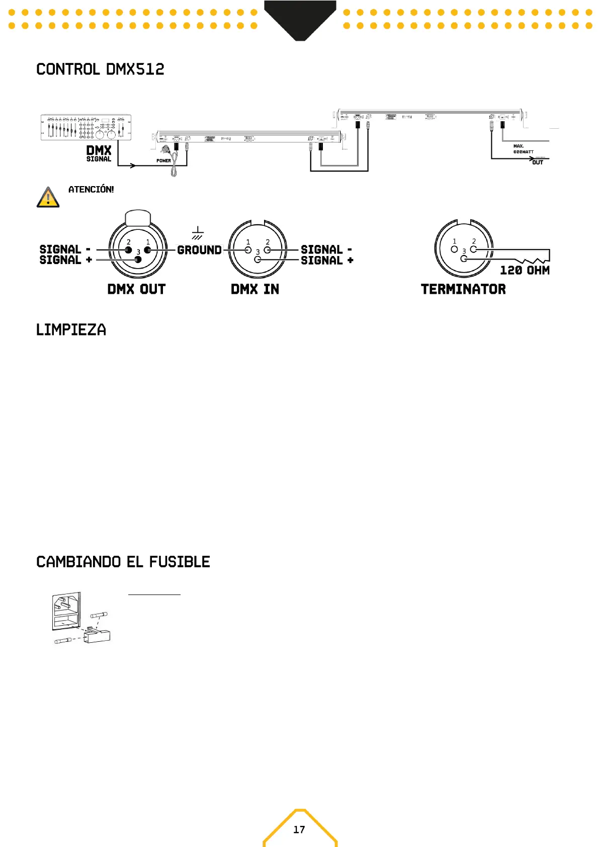 de 120 Ohm entre la señal (-) y la señal (+) y conéctela a la salida DMX del último dispositivo en la línea.
