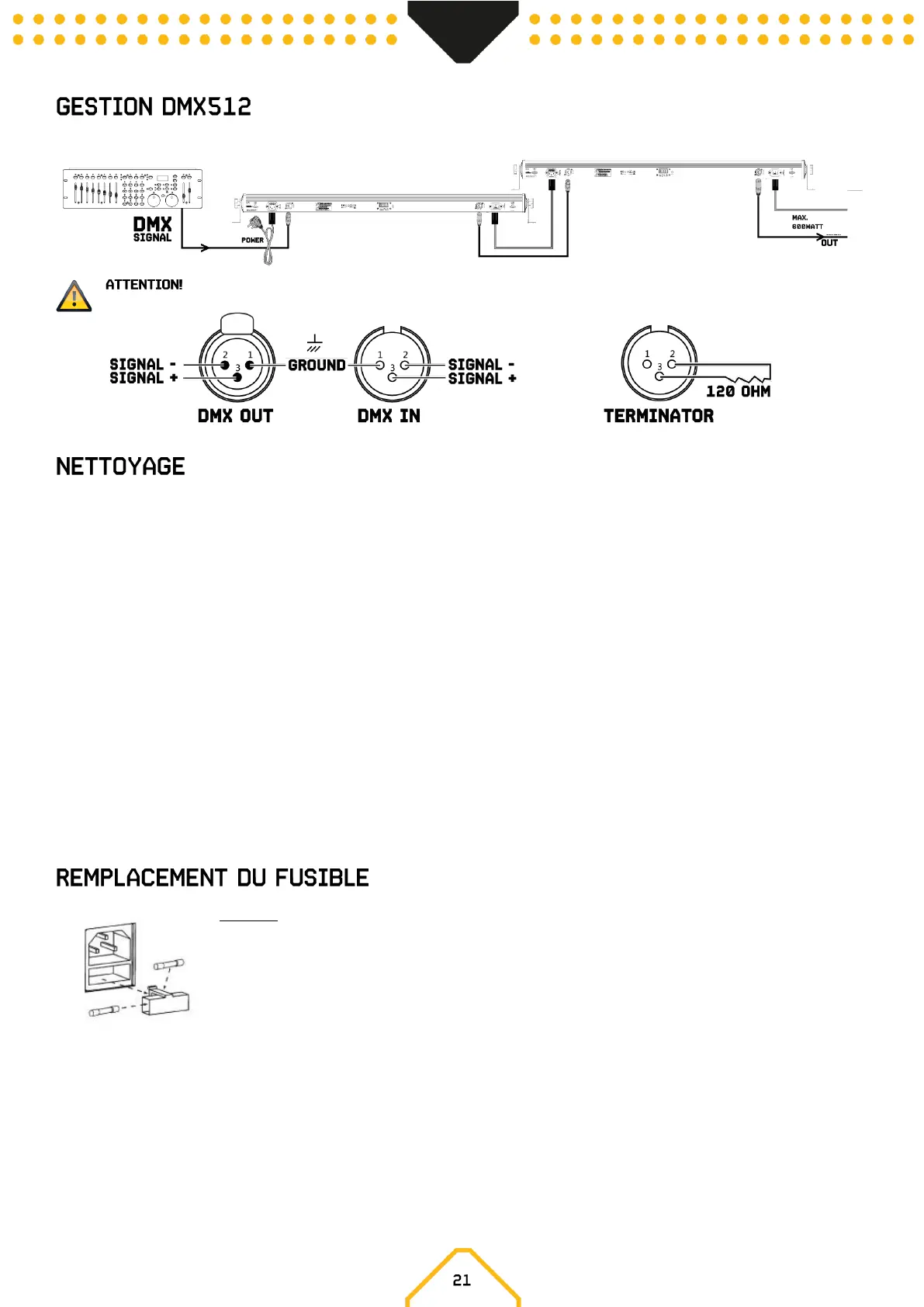 de 120 ohms entre le signal (-) et le signal (+) et connectez-la à la sortie DMX du dernier appareil sur la ligne.