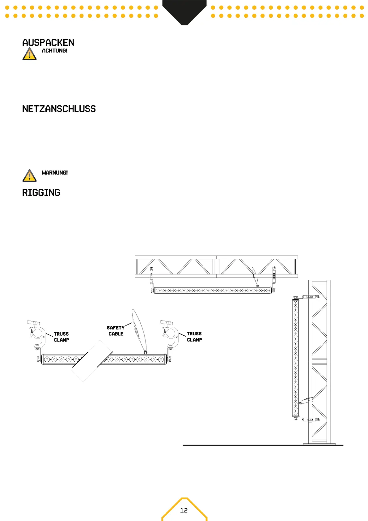 Befolgen Sie bei der Durchführung einer Installation immer die europäischen und nationalen Richtlinien bezüglich Rigging, Traversen und allen anderen