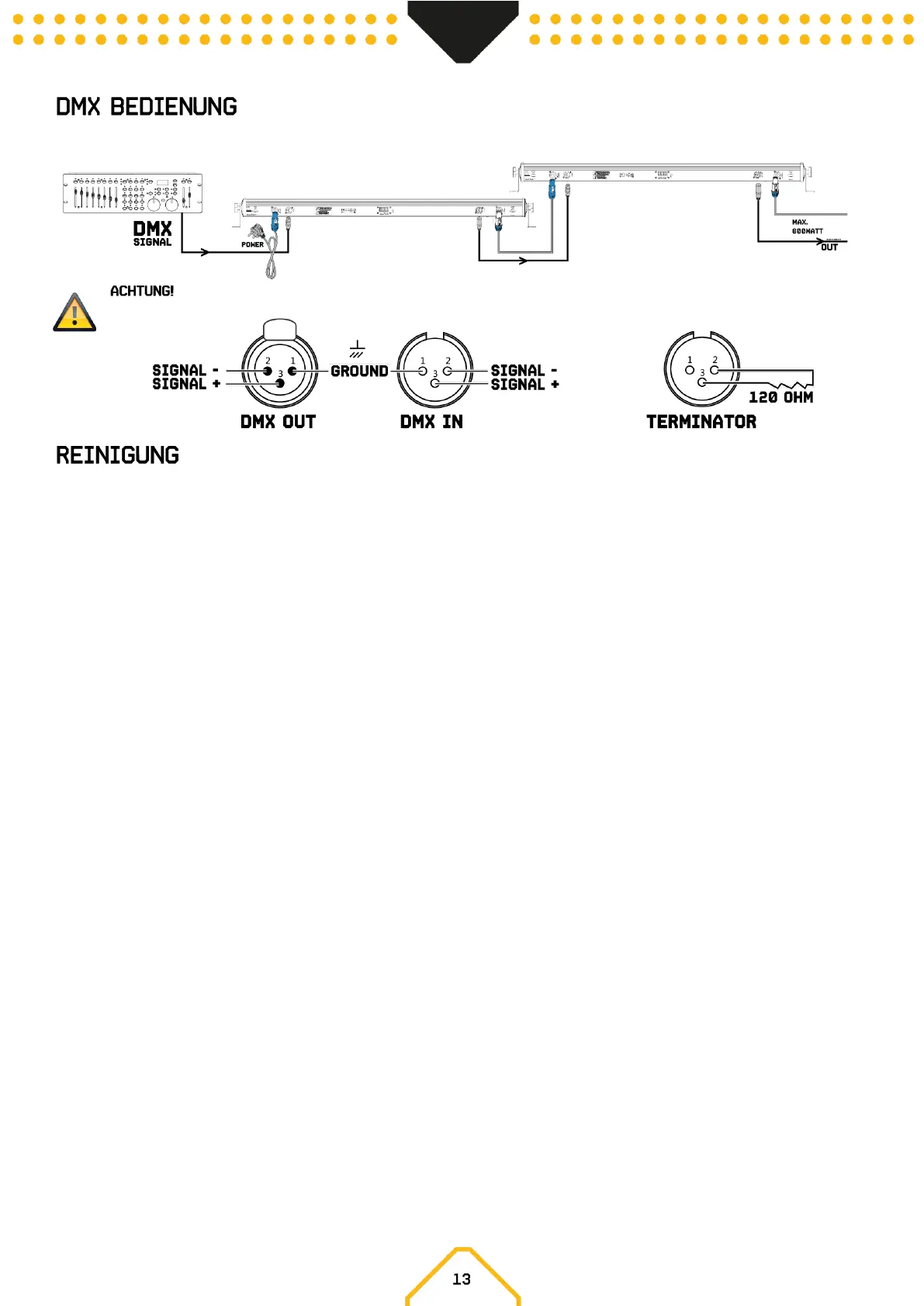 Sie einen 120-Ohm-Widerstand zwischen Signal (-) und Signal (+) und stecken Sie diesen in den DMX-Ausgang der letzten Gerät in der Leitung.