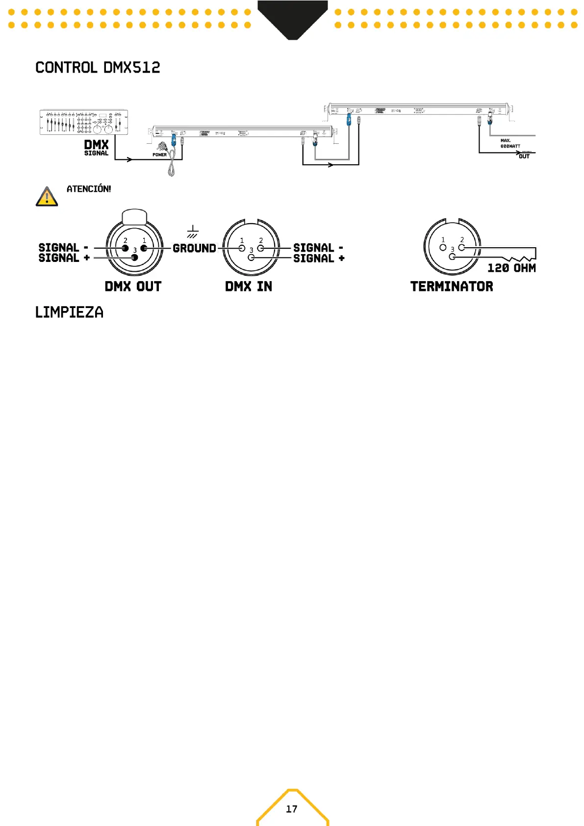 de 120 Ohm entre la señal (-) y la señal (+) y conéctela a la salida DMX del último dispositivo en la línea.