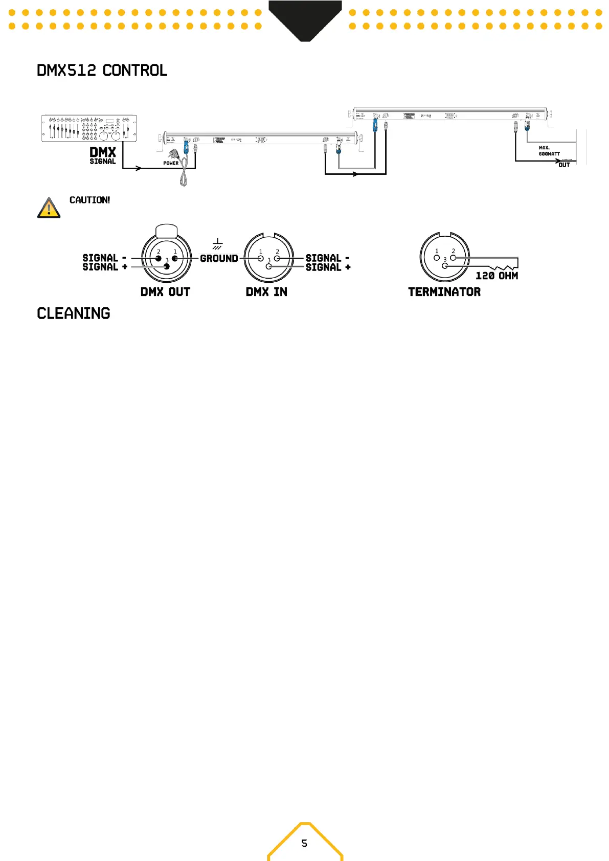 between signal (-) and signal (+) and connect it to the DMX output of the last unit in the line.