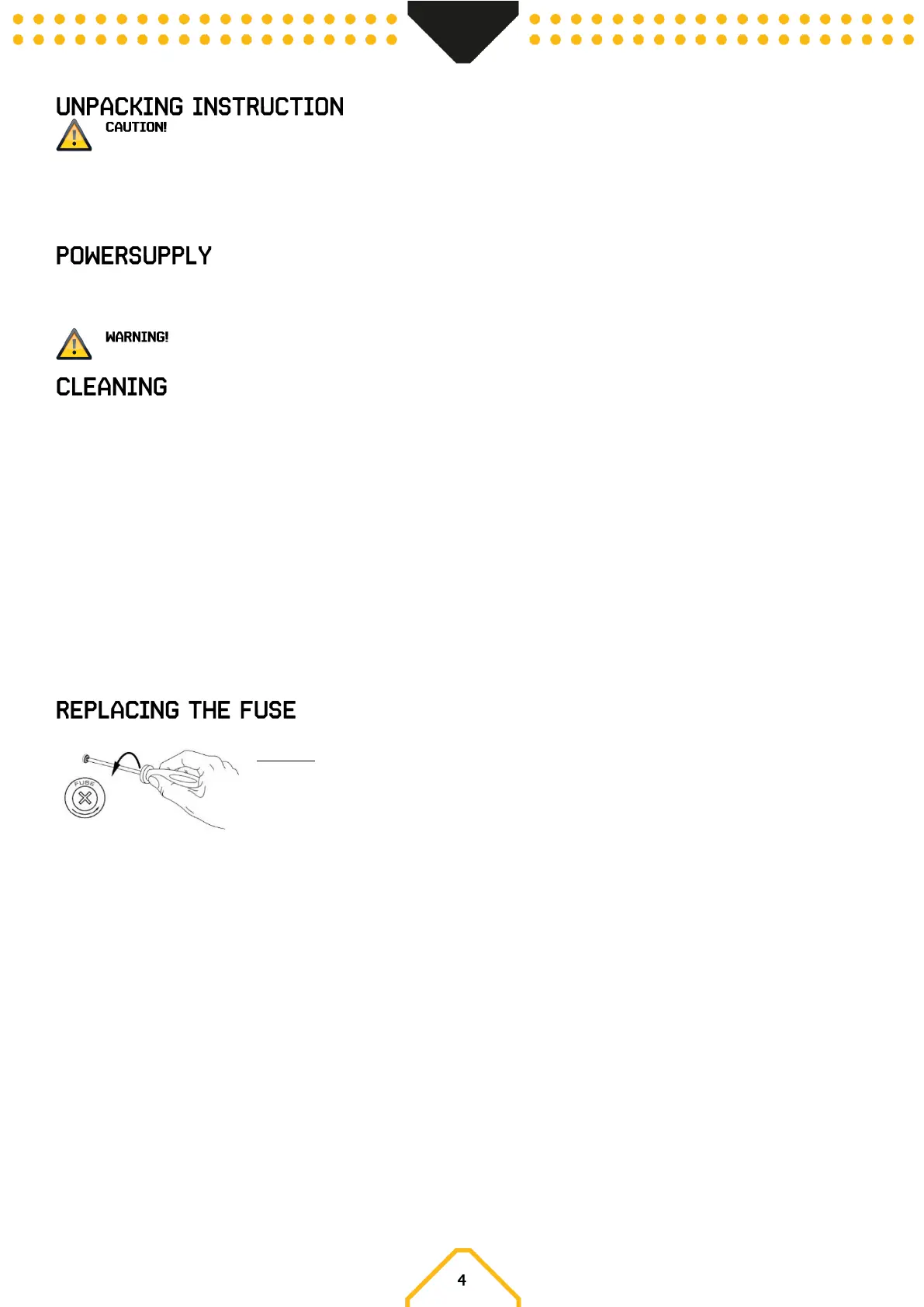 If the fuse is defective, replace the fuse with a fuse of the same type and value. Before replacing the fuse, unplug mains lead.