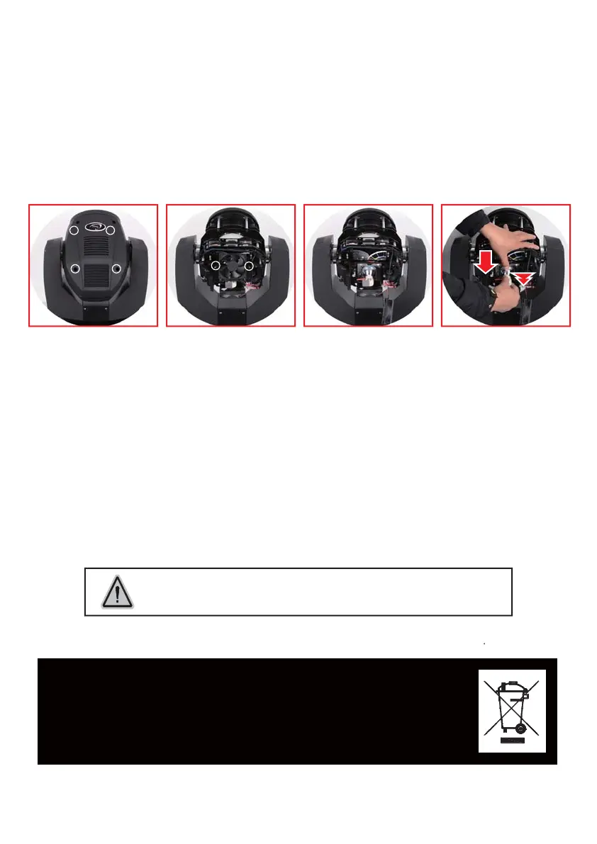 The moving head is equipped with an Osram 230W lam. Follow the procedure below