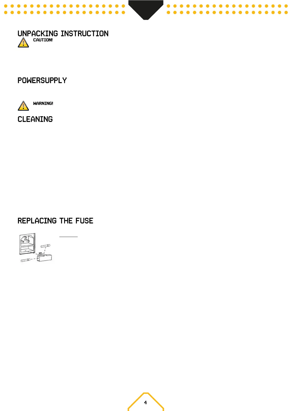 If the fuse is defective, replace the fuse with a fuse of the same type and value. Before replacing the fuse, unplug mains lead.