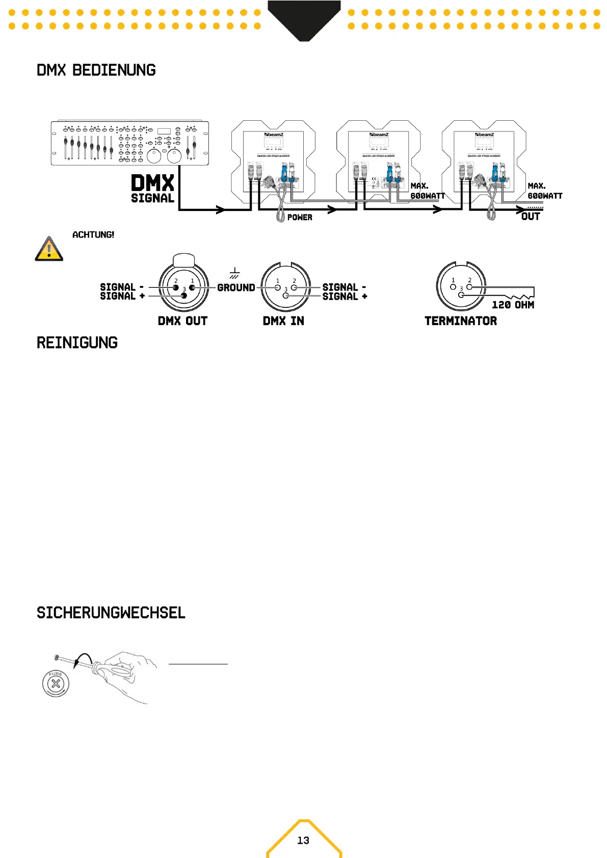 Sie einen 120-Ohm-Widerstand zwischen Signal (-) und Signal (+) und stecken Sie diesen in den DMX-Ausgang der letzten Gerät in der Leitung.