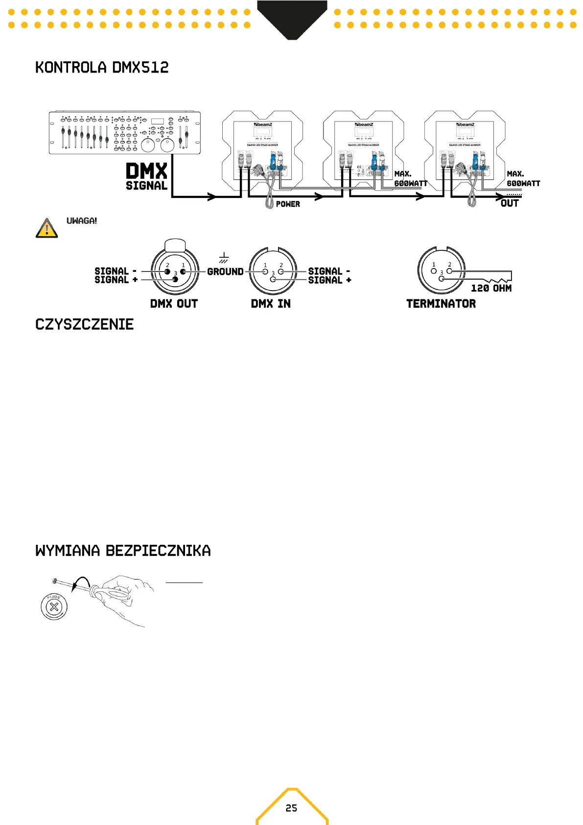 (-) a sygnałem (+) i podłącz go do wyjścia DMX ostatniego urządzenia w linii.
