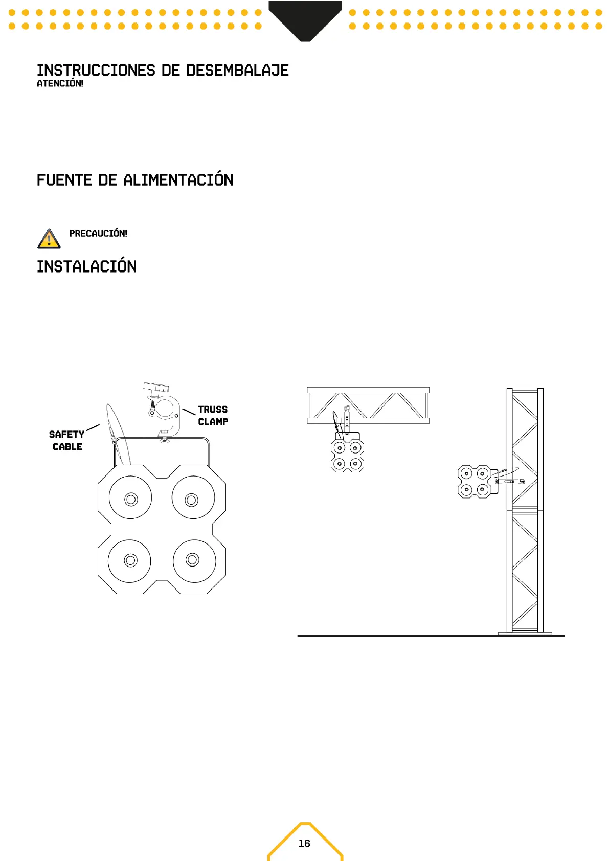 puede montar boca abajo a un truss, vea la imagen de abajo. Para la fijación, se requieren abrazaderas certificadas con la carga de trabajo correcta.