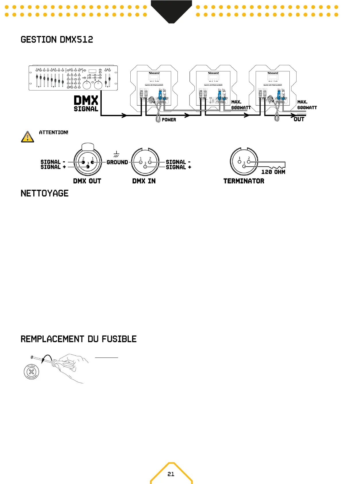 résistance de 120 ohms entre le signal (-) et le signal (+) et connectez-la à la sortie DMX du dernier appareil sur la ligne.