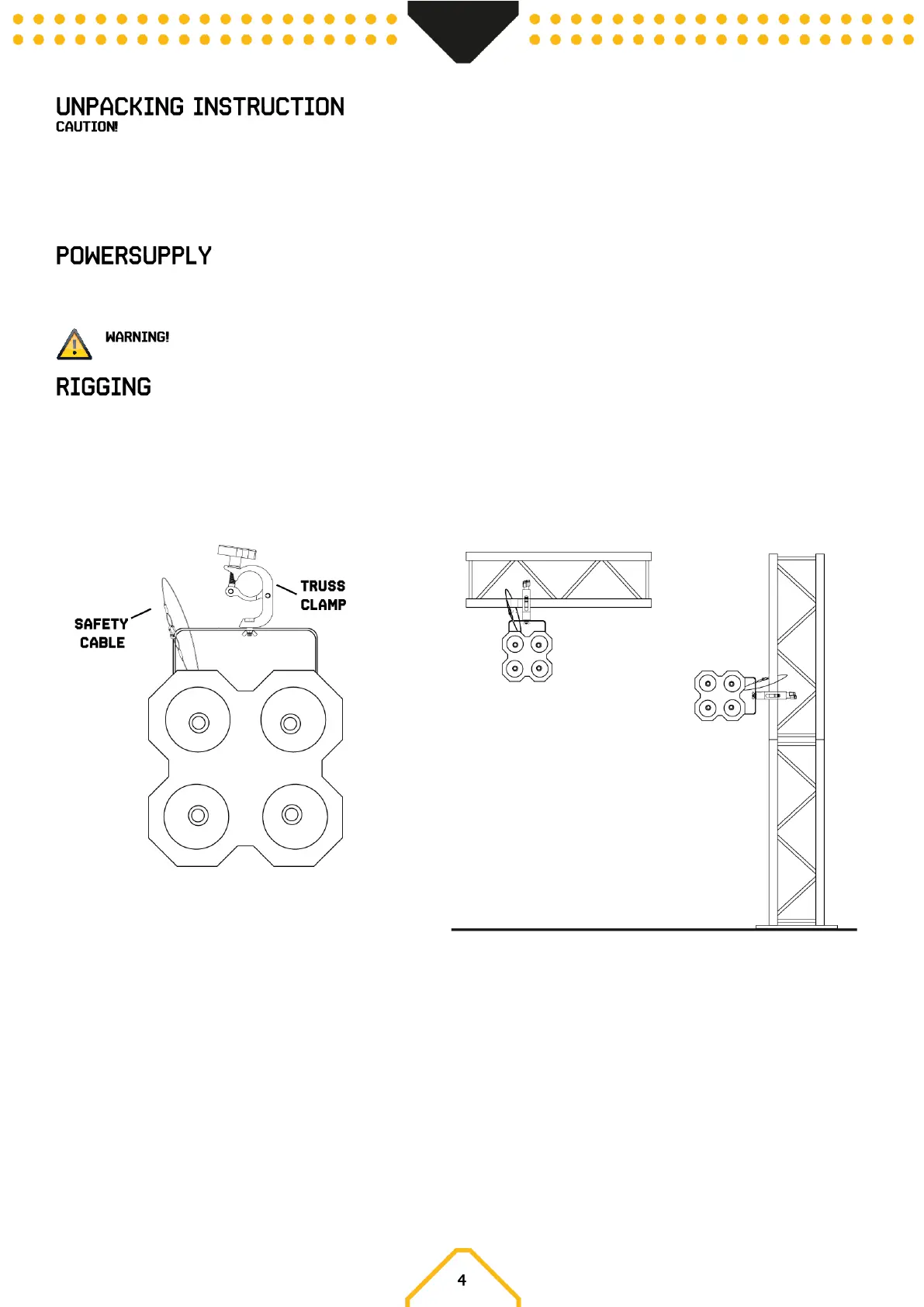 When carrying out any installation, always comply European and national guidelines concerning rigging, truss and all other safety issues. Always let the