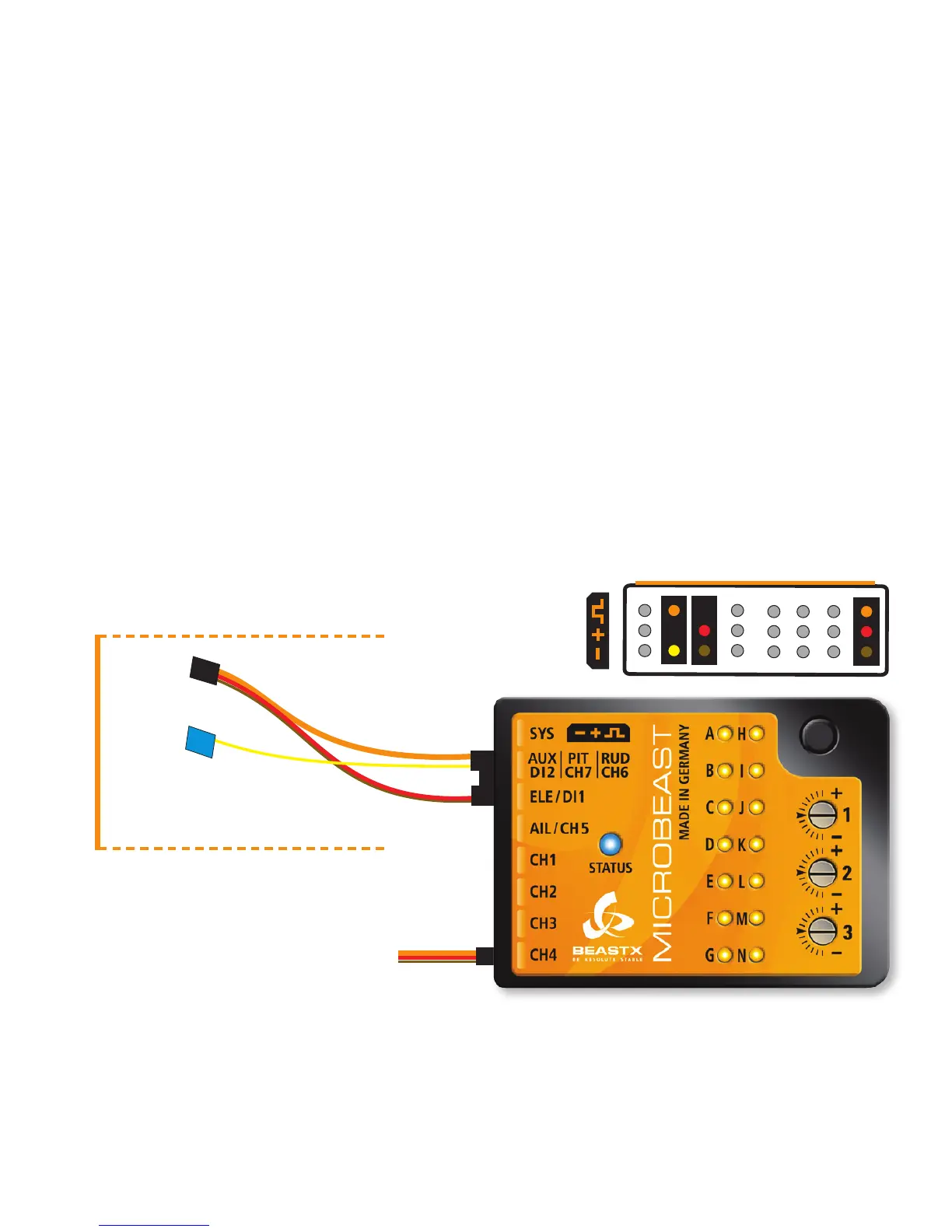 The signal lead with the orange and yellow wires must be connected to the slot [ Aux | Pit | Rud ]. The orange wire