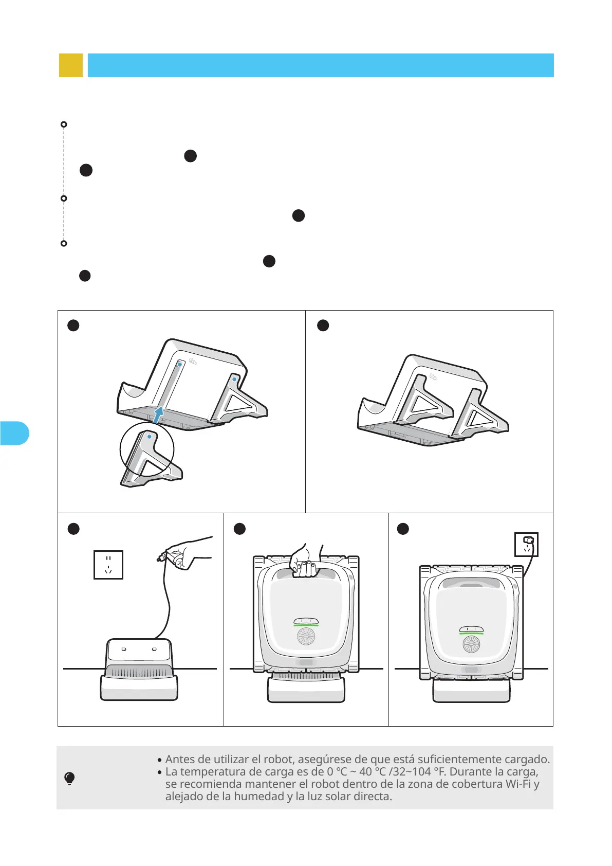 Coloque el robot en el dock de carga ( ). Cuando el indicador luminoso muestre una luzpulsante