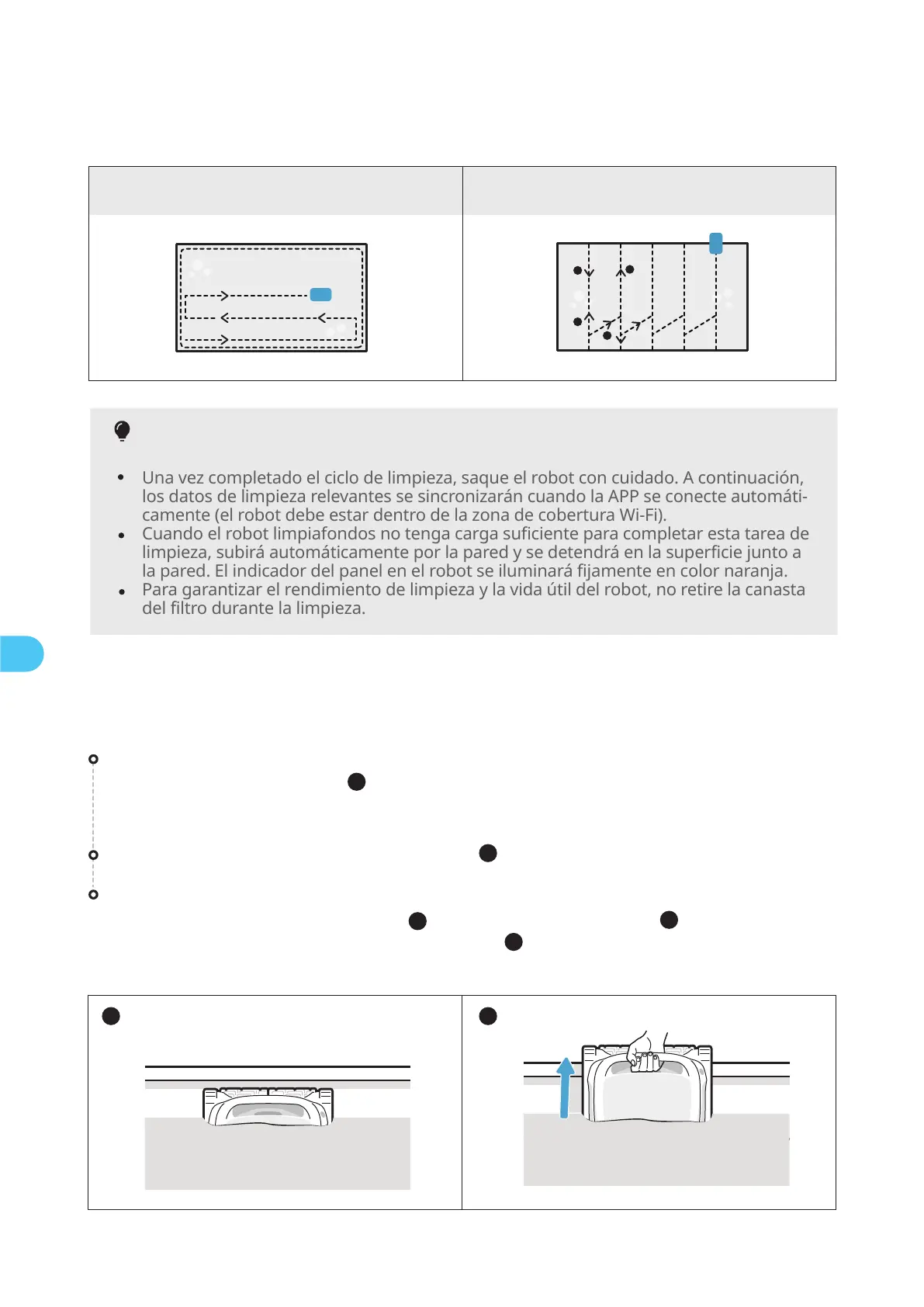 limpieza, subirá automáticamente por la pared y se detendrá en la superficie junto a