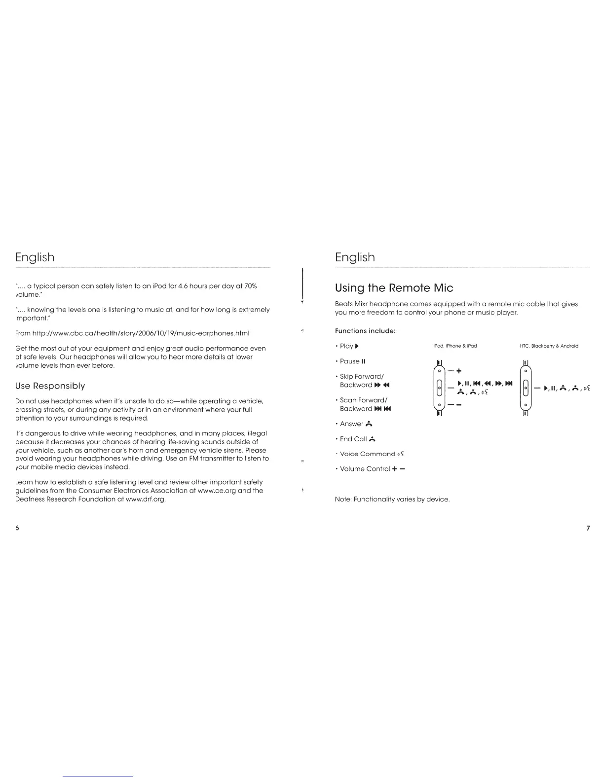 Beats Electronics Mixr - Responsible Usage Guidelines; Safe Listening and Environmental Awareness; Using the Remote Mic; Remote Mic Functions Overview