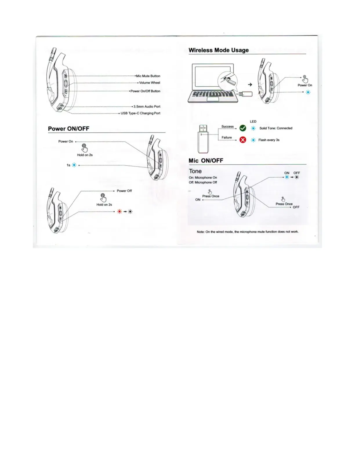 BEAVIIOO HW01 - Wireless Mode Operations; Powering On and Off; Microphone Mute Functionality