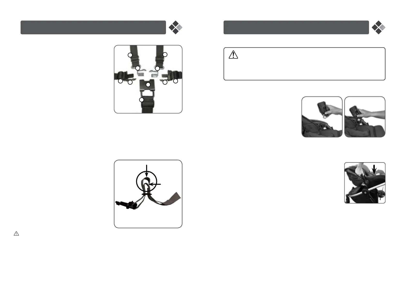 1. To secure the child in the harness, place left