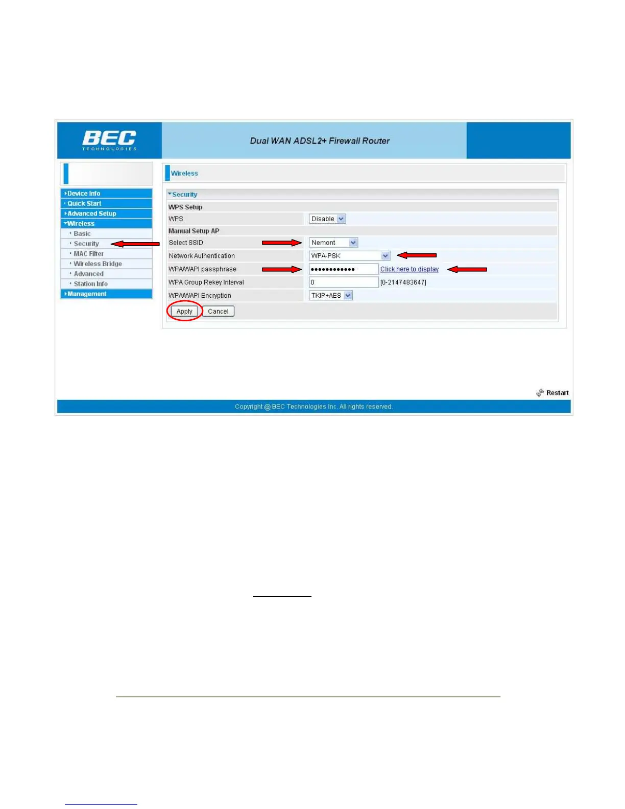 To setup the wireless security click on the "Security" link on the left side of the page under "Wireless".