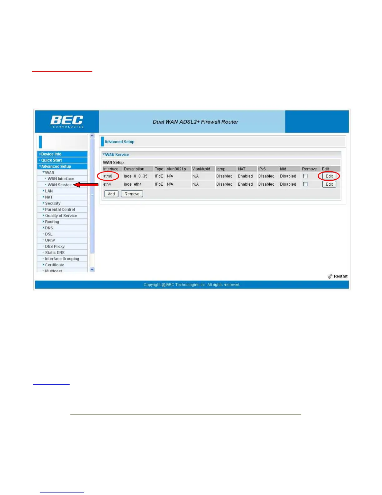 If the modem is on an ADSL connection then click the “Edit” button for the interface “atm0” and