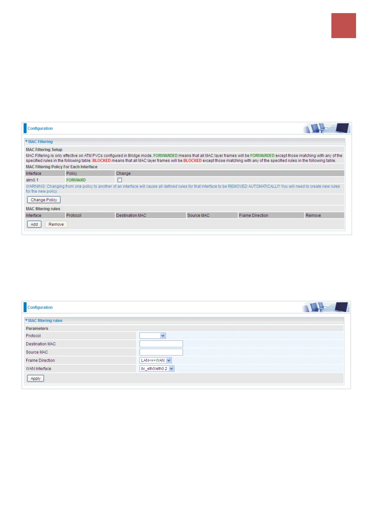 MAC Filtering is only effective on ATM PVCs configured in Bridged mode.