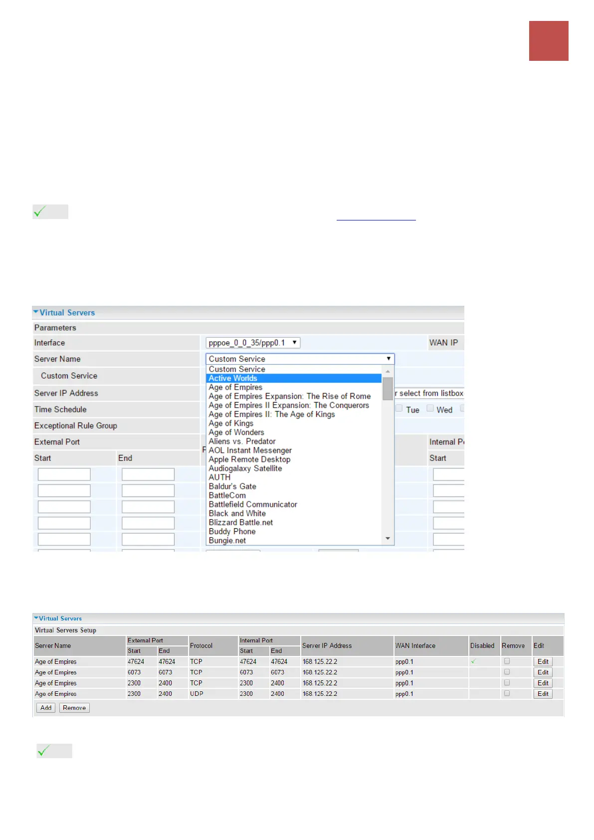 of your own by specifying the Server IP Address, External Port, and Internal Port.