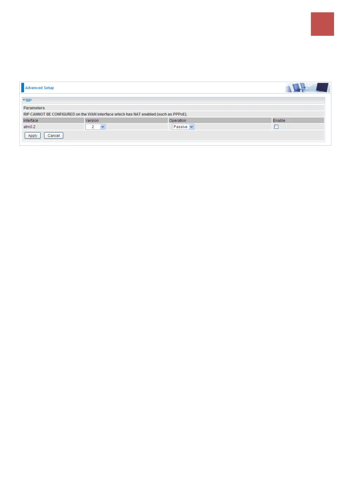 Note: RIP can’t be configured on the WAN interface which has NAT enabled (such as PPPoE).