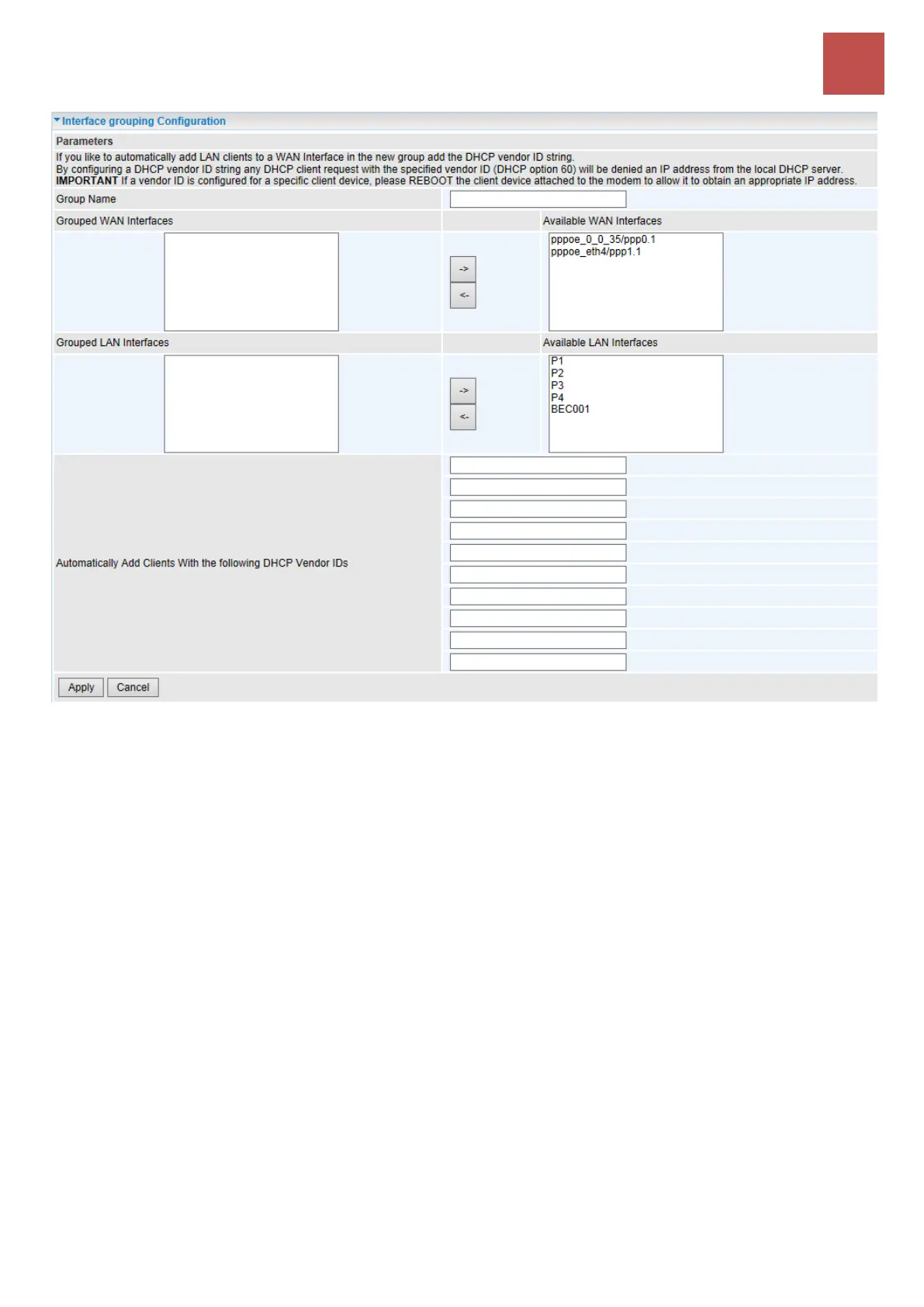 Grouped LAN Interfaces: Select the LAN interfaces you want to group as a single group from the