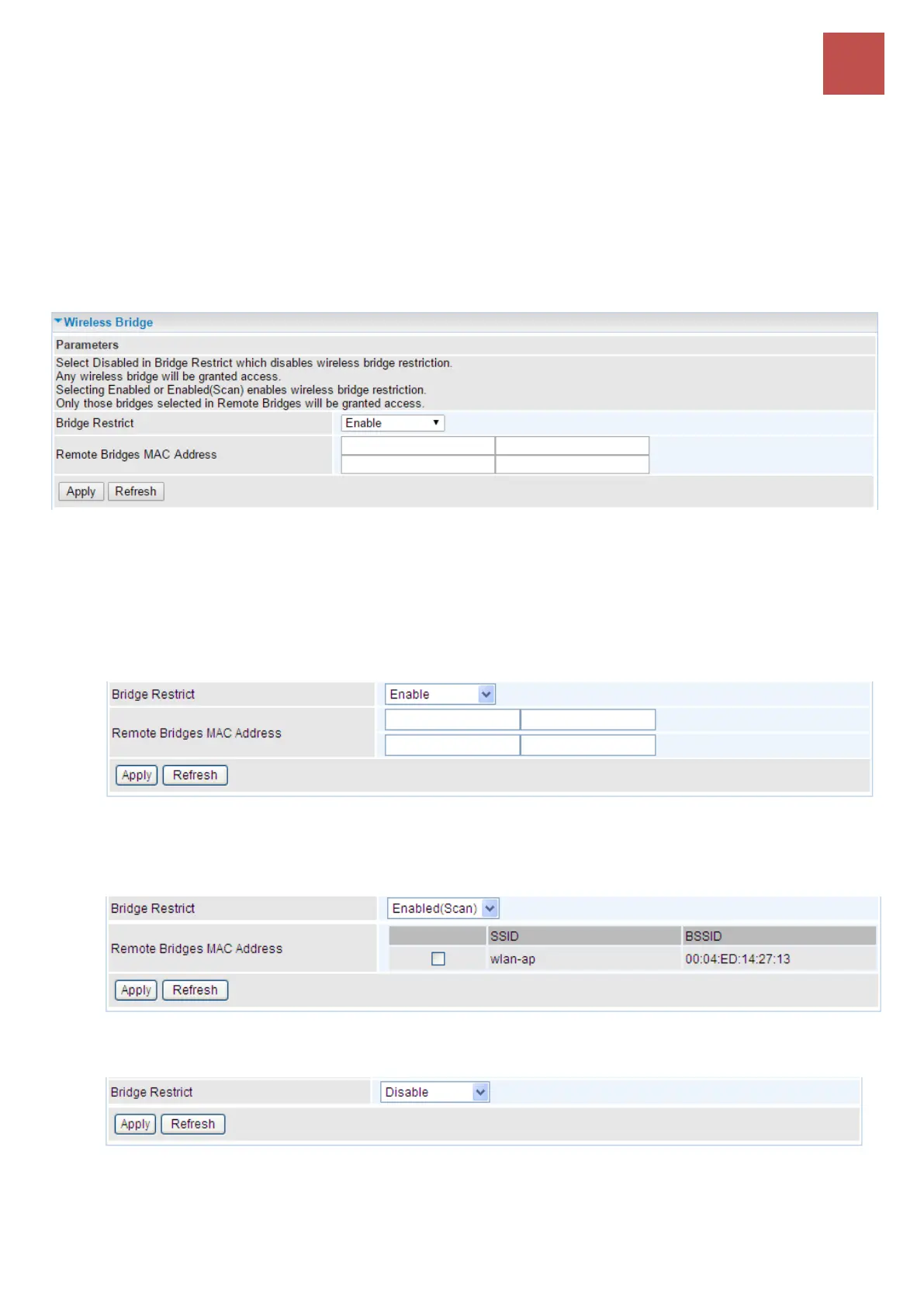 Enabled (Scan): to enable wireless bridge restriction. Only those scanned by the gateway can