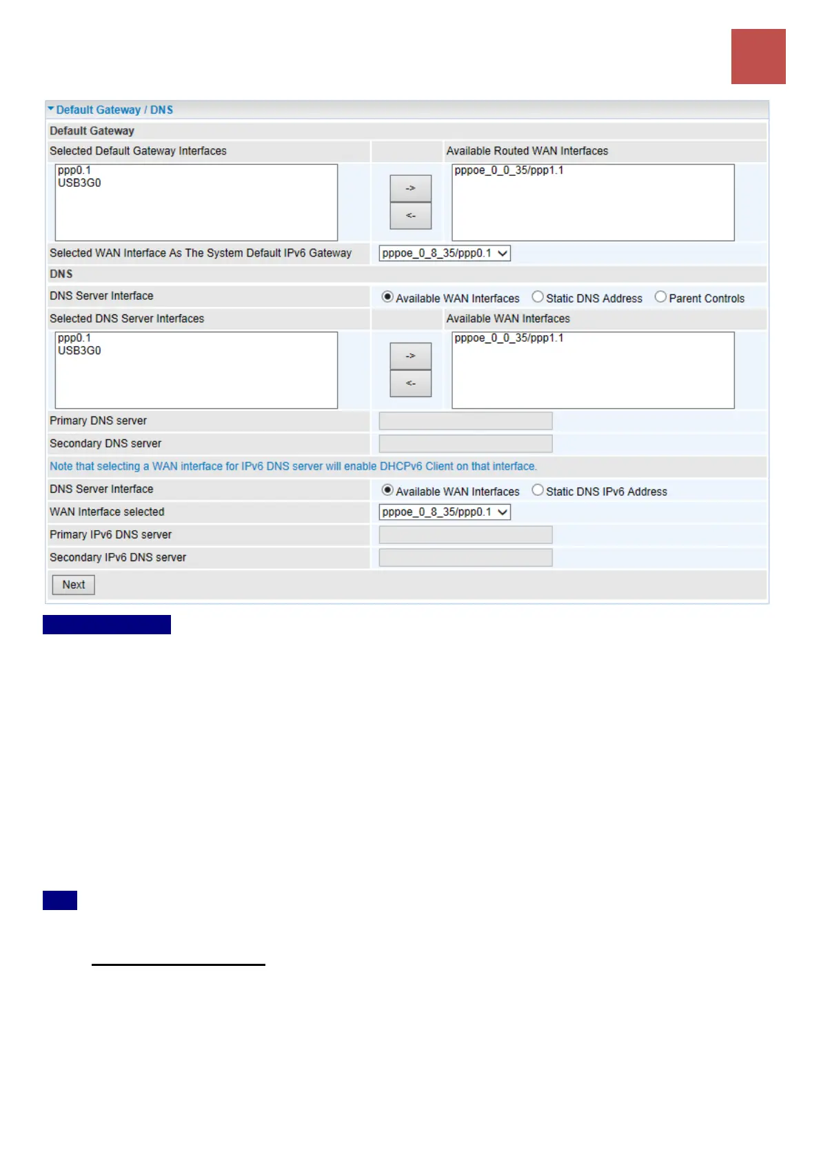 To remove interface(s) from Selected Default Gateway Interface box, simply click the unwanted