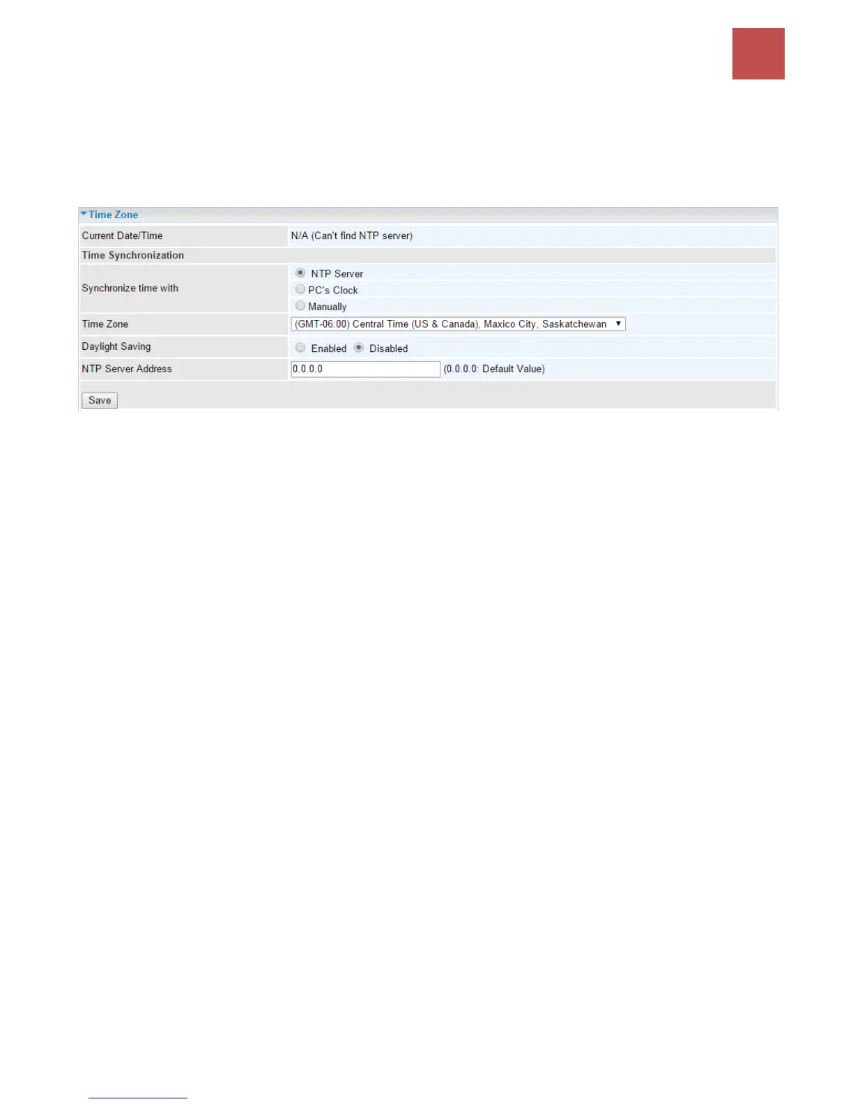 NTP Server Address: Enter the IP address of your time server. Check with your ISP/network
